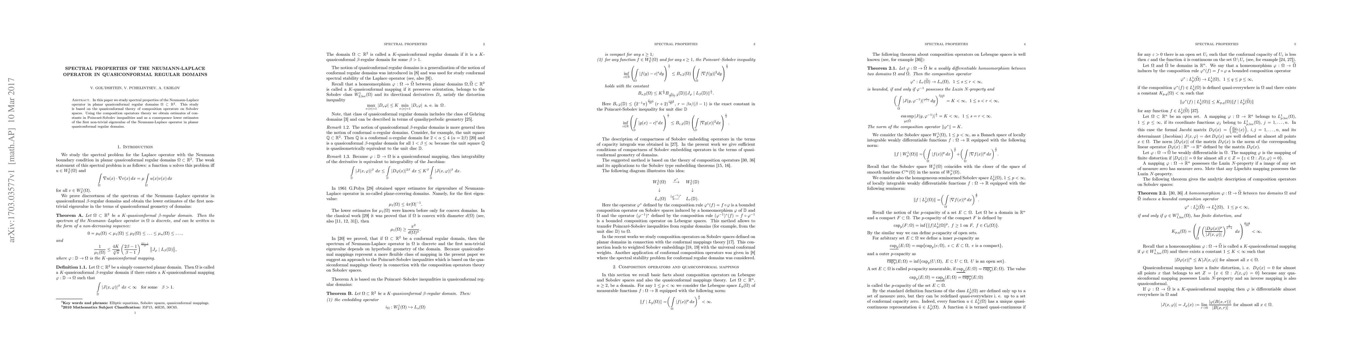 In this paper we study spectral properties of the Neumann-Laplace operator in planar quasiconformal regular domains $\Omega\subset\mathbb R^2$. This study is based on the quasiconformal theory of composition operators on Sobolev spaces. Using the composition operators theory we obtain estimates of constants in Poincar\'e-Sobolev inequalities and as a consequence lower estimates of the first non-trivial eigenvalue of the Neumann-Laplace operator in planar quasiconformal regular domains.