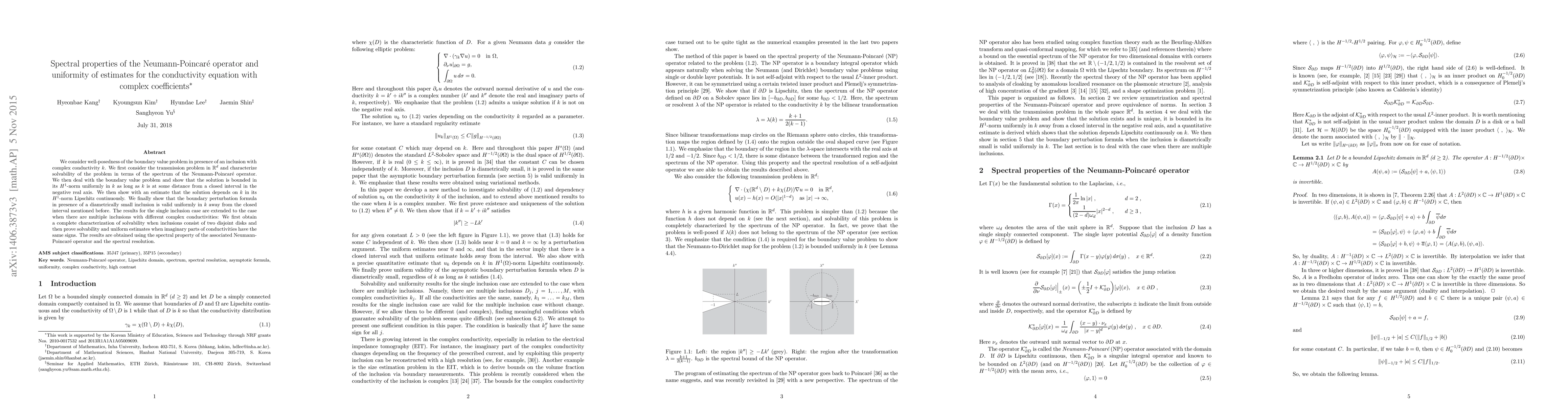 This paper investigates the well-posedness of boundary value problems for the conductivity equation with complex coefficients, focusing on the spectral properties of the Neumann-Poincaré operator. It demonstrates uniform boundedness and Lipschitz continuity of the solution in $H^1$-norm away from a specific interval in the negative real axis, extending results to multiple inclusions with different complex conductivities.