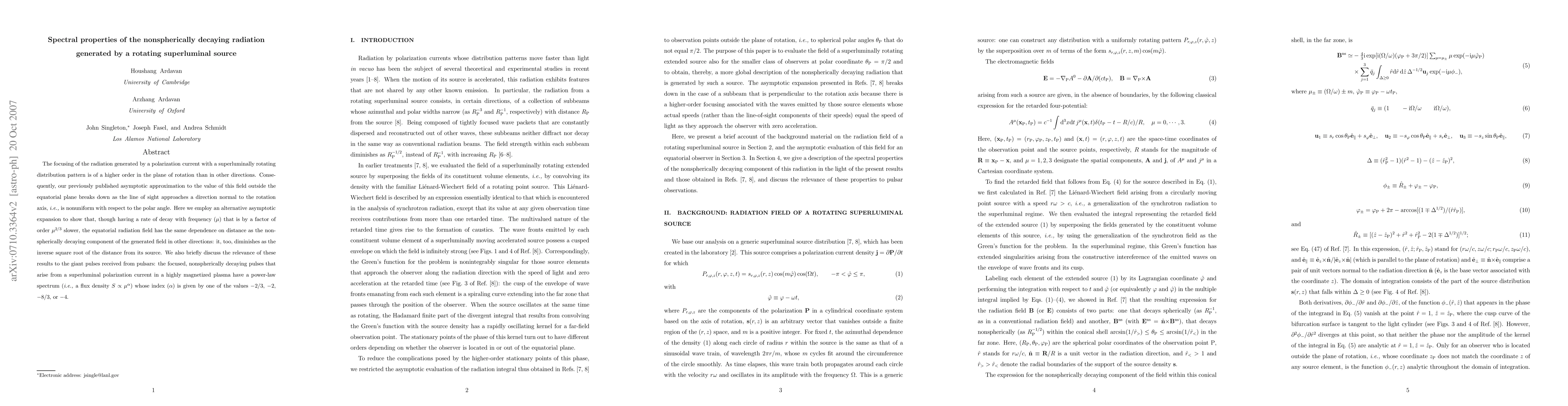 This paper investigates the spectral properties of radiation from a rotating superluminal source, showing that the equatorial radiation field decays as the inverse square root of distance, similar to the nonspherically decaying component. It also discusses the relevance of these findings to the giant pulses from pulsars, which exhibit a power-law spectrum with specific indices.