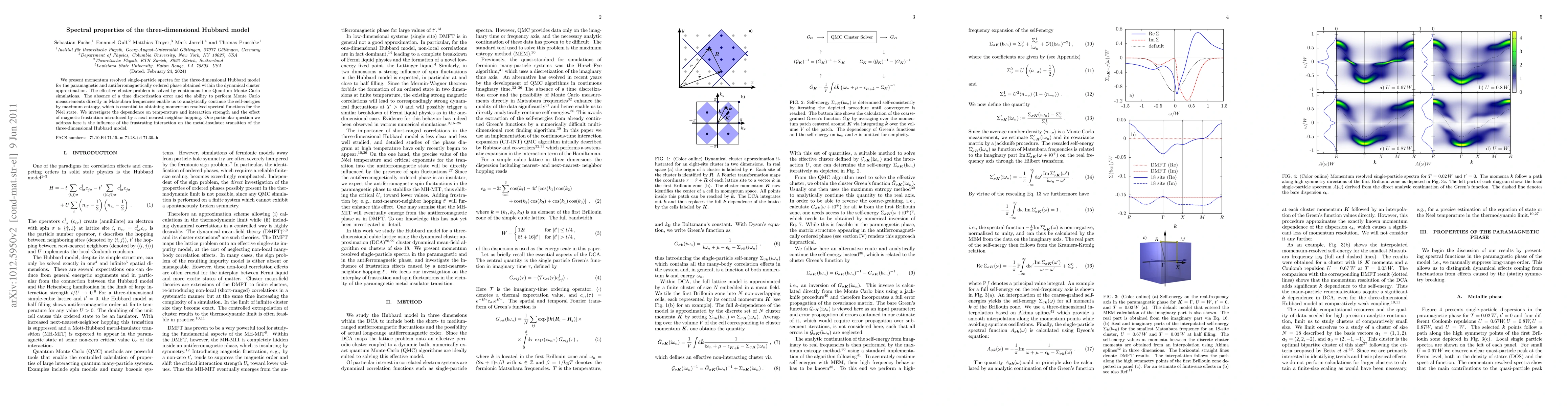 This paper investigates the spectral properties of the three-dimensional Hubbard model in both paramagnetic and antiferromagnetic phases using the dynamical cluster approximation and continuous-time Quantum Monte Carlo simulations. It focuses on the metal-insulator transition and the impact of magnetic frustration on the model's behavior.