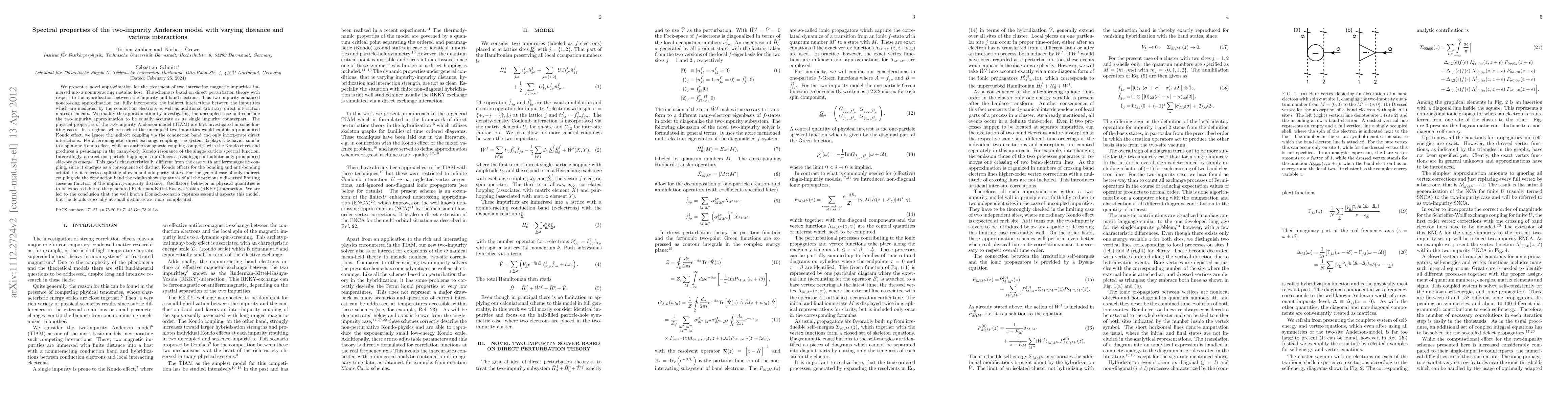 This paper introduces a novel two-impurity enhanced noncrossing approximation (TIE) to study the spectral properties of two interacting magnetic impurities in a metallic host. The TIE method captures both direct and indirect interactions mediated by conduction electrons, revealing complex behaviors such as pseudogaps and side-peaks depending on the impurity-impurity distance and the nature of direct interactions.