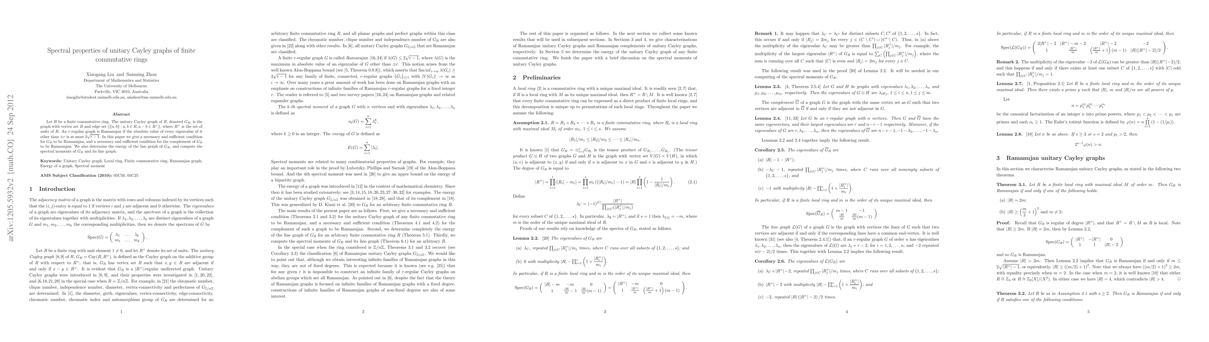 This paper investigates the spectral properties of unitary Cayley graphs of finite commutative rings, providing necessary and sufficient conditions for these graphs and their complements to be Ramanujan. It also determines the energy of the line graph of the Cayley graph and computes the spectral moments of both the graph and its line graph.