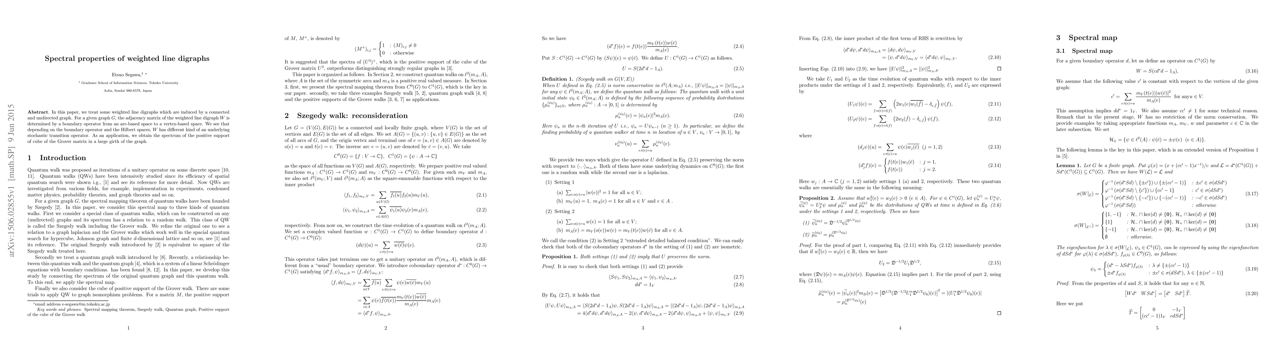 This paper investigates the spectral properties of weighted line digraphs derived from a connected, undirected graph. It determines the adjacency matrix of these digraphs through a boundary operator, revealing diverse stochastic transition operators based on the operator and Hilbert space used. An application demonstrates the spectrum of the positive support of the cube of the Grover matrix in large girth graphs.