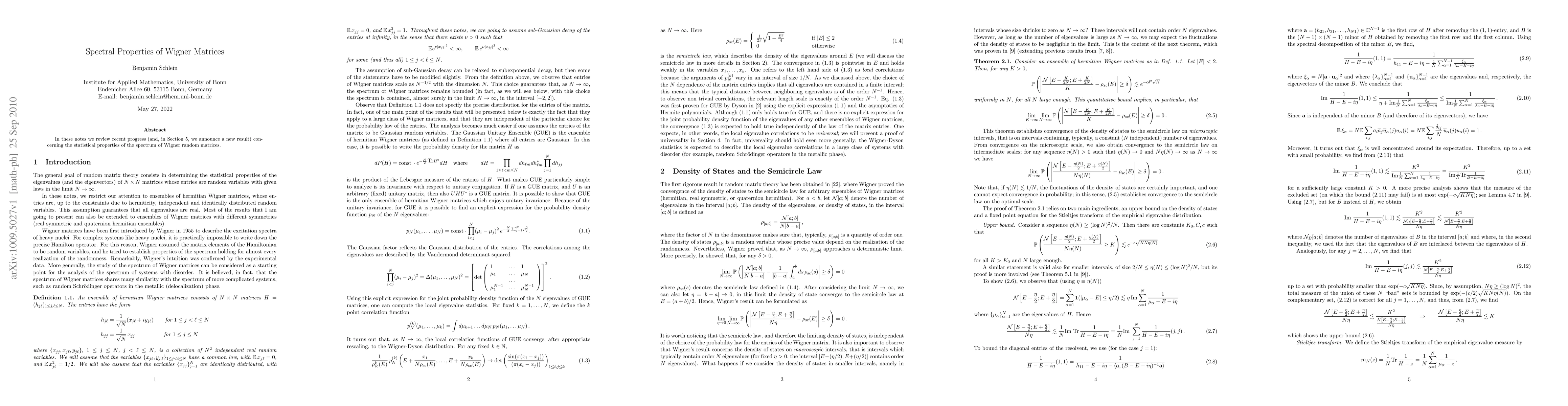 Summary: This paper reviews recent advancements in understanding the statistical properties of the spectrum of Wigner random matrices, and introduces a new result in the process. The focus is on the spectral properties of these matrices.