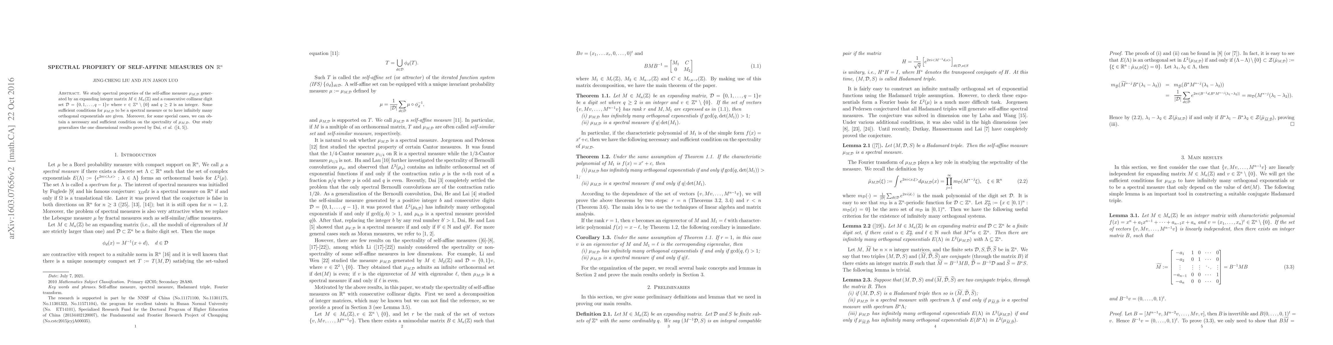 This paper studies spectral properties of self-affine measures on ${f R}^n$, focusing on conditions for these measures to be spectral or have infinitely many orthogonal exponentials. The study generalizes one-dimensional results and aims to understand the behavior of expanding integer matrices and digit sets in generating spectral measures.