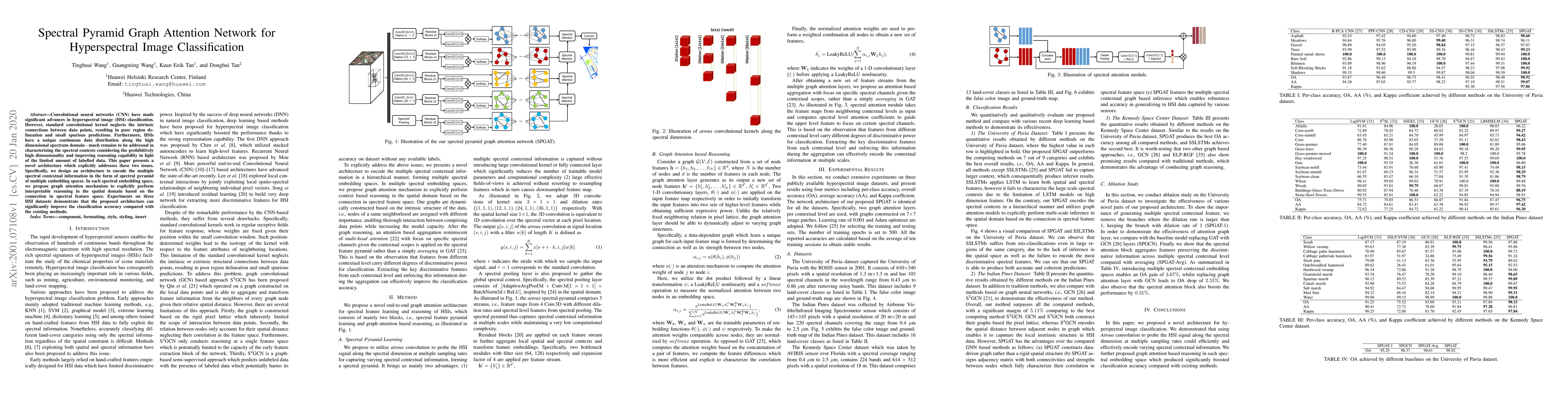 This paper introduces a Spectral Pyramid Graph Attention Network to enhance hyperspectral image classification. The proposed architecture addresses the limitations of standard CNNs by incorporating spectral pyramid embeddings and graph attention mechanisms to better capture spectral context and improve classification accuracy.