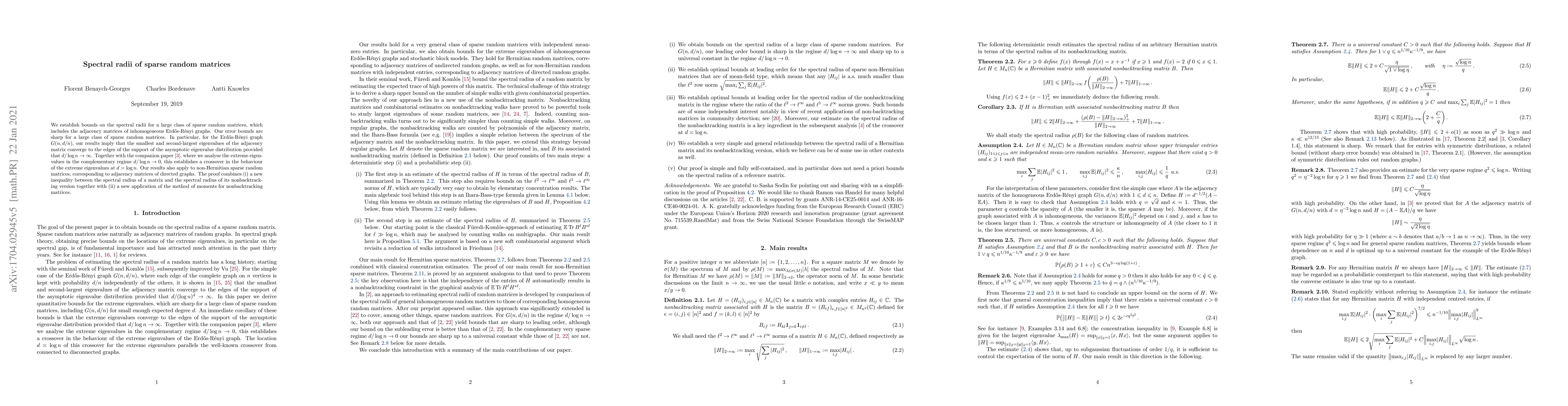 This paper establishes sharp bounds on the spectral radii for a wide range of sparse random matrices, including adjacency matrices of inhomogeneous Erdős-Rényi graphs. The results show convergence of the smallest and second-largest eigenvalues for $G(n,d/n)$ as $d \gg \log n$, revealing a crossover in eigenvalue behavior around $d \sim \log n$.