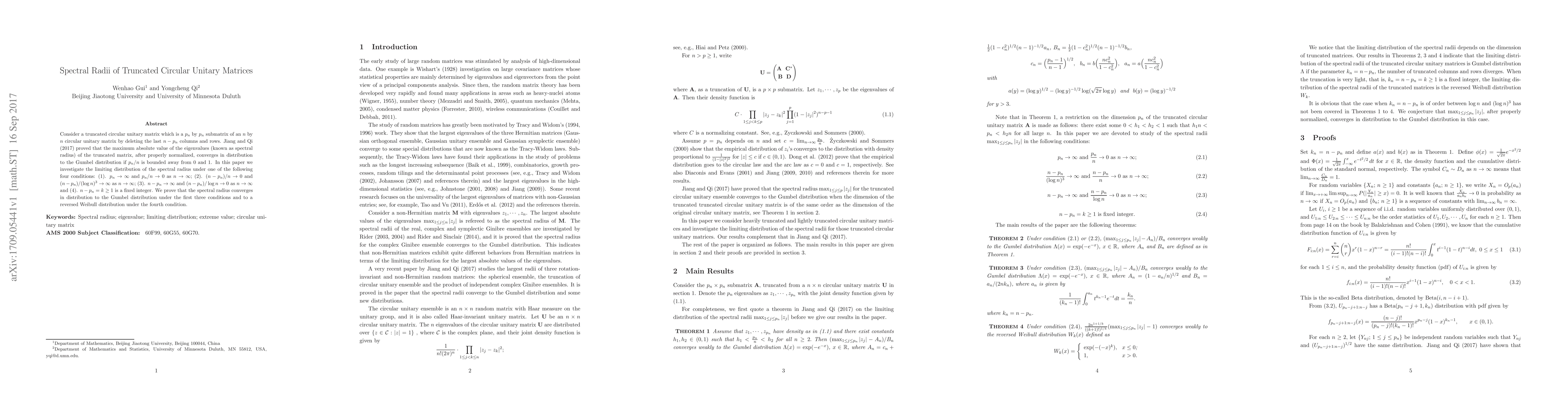Consider a truncated circular unitary matrix which is a $p_n$ by $p_n$ submatrix of an $n$ by $n$ circular unitary matrix by deleting the last $n-p_n$ columns and rows. Jiang and Qi (2017) proved that the maximum absolute value of the eigenvalues (known as spectral radius) of the truncated matrix, after properly normalized, converges in distribution to the Gumbel distribution if $p_n/n$ is bounded away from $0$ and $1$. In this paper we investigate the limiting distribution of the spectral radius under one of the following four conditions: (1). $p_n\to\infty$ and $p_n/n\to 0$ as $n\to\infty$; (2). $(n-p_n)/n\to 0$ and $(n-p_n)/(\log n)^3\to\infty$ as $n\to\infty$; (3). $n-p_n\to\infty$ and $(n-p_n)/\log n\to 0$ as $n\to\infty$ and (4). $n-p_n=k\ge 1$ is a fixed integer. We prove that the spectral radius converges in distribution to the Gumbel distribution under the first three conditions and to a reversed Weibull distribution under the fourth condition.