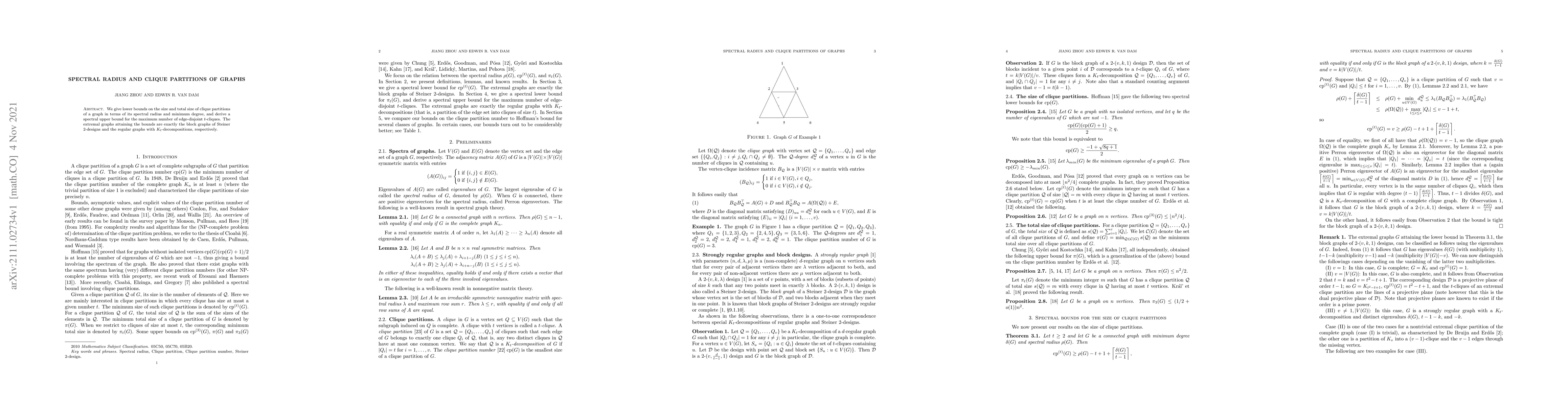 This paper provides lower bounds on the size and total size of clique partitions in graphs, linked to the spectral radius and minimum degree, and establishes a spectral upper bound for the maximum number of edge-disjoint $t$-cliques, with extremal graphs being block graphs of Steiner $2$-designs and regular graphs with $K_t$-decompositions.