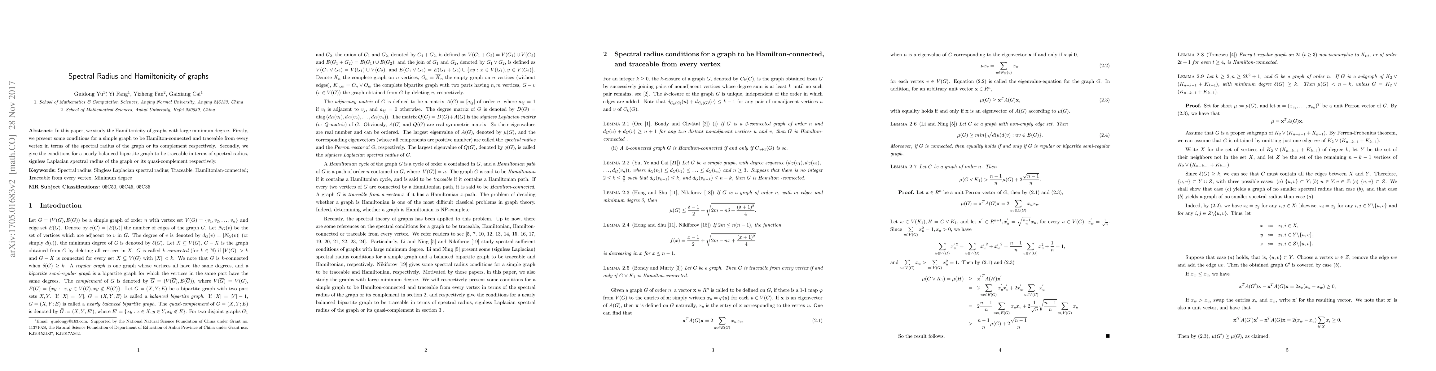 This paper explores Hamiltonicity conditions for graphs based on spectral radius and related concepts. It provides criteria for Hamilton-connectivity and traceability in simple graphs, and nearly balanced bipartite graphs, using spectral radius and signless Laplacian spectral radius.