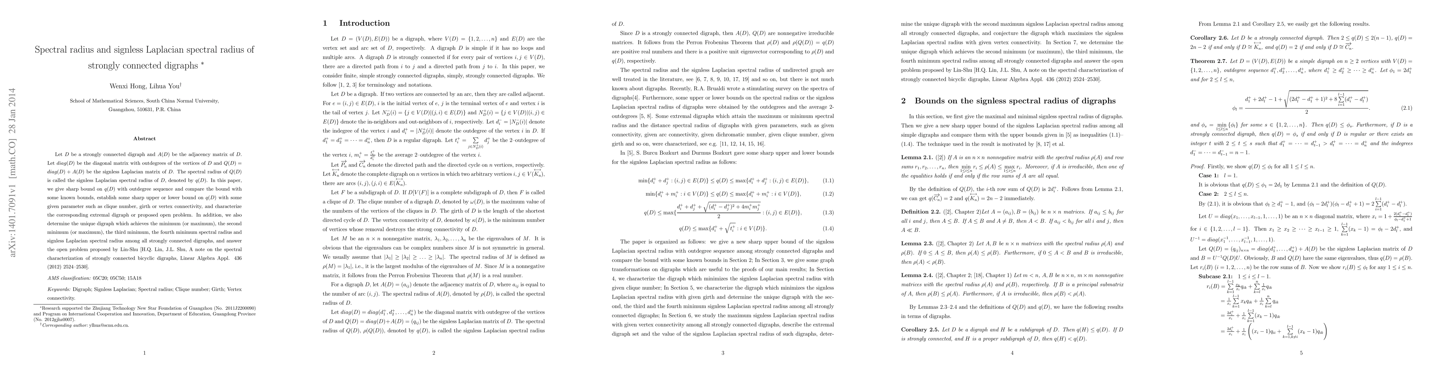 This research provides sharp bounds for the signless Laplacian spectral radius (q(D)) of strongly connected digraphs, comparing these bounds with known parameters and identifying extremal digraphs achieving minimum or maximum values. It also addresses an open problem proposed by Lin-Shu regarding spectral characterization of strongly connected bicyclic digraphs.