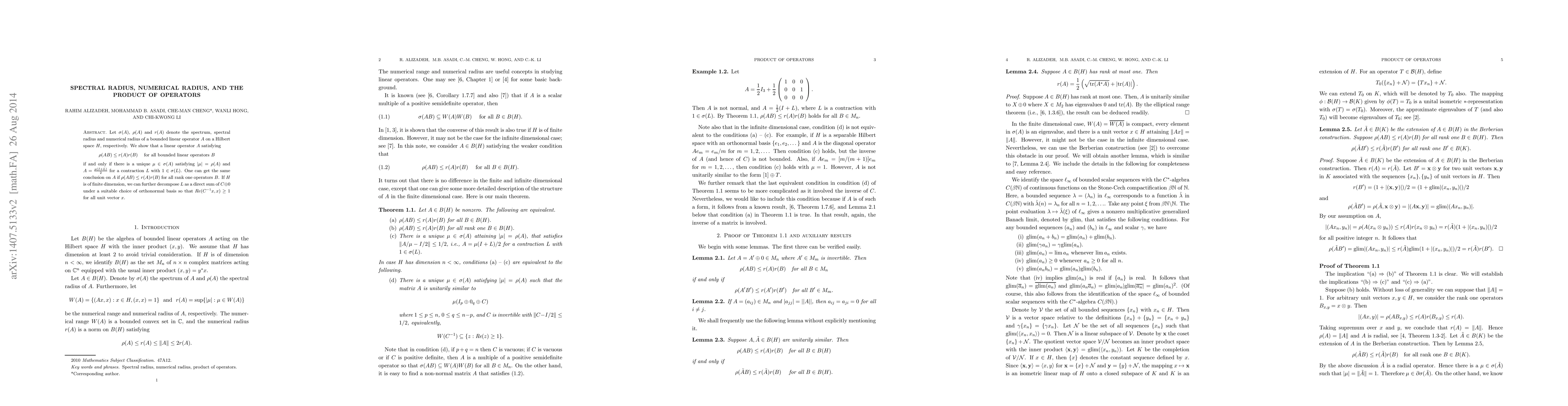 Let $\sigma(A)$, $\rho(A)$ and $r(A)$ denote the spectrum, spectral radius and numerical radius of a bounded linear operator $A$ on a Hilbert space $H$, respectively. We show that a linear operator $A$ satisfying $$\rho(AB)\le r(A)r(B) \quad\text{ for all bounded linear operators } B$$ if and only if there is a unique $\mu \in \sigma (A)$ satisfying $|\mu| = \rho(A)$ and $A = \frac{\mu(I + L)}{2}$ for a contraction $L$ with $1\in\sigma(L)$. One can get the same conclusion on $A$ if $\rho(AB) \le r(A)r(B)$ for all rank one operators $B$. If $H$ is of finite dimension, we can further decompose $L$ as a direct sum of $C \oplus 0$ under a suitable choice of orthonormal basis so that $Re(C^{-1}x,x) \ge 1$ for all unit vector $x$.