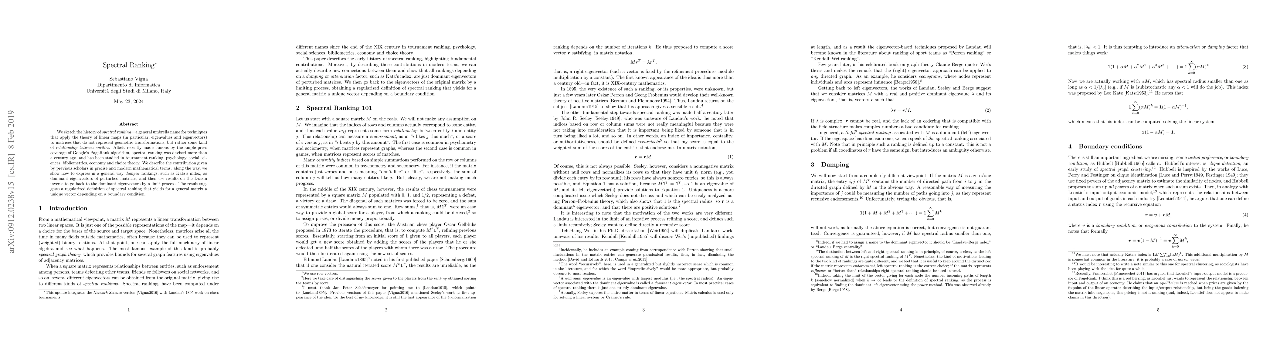 Spectral ranking employs linear maps, particularly eigenvalues and eigenvectors, to analyze relationships between entities, not just geometric transformations. This method, popularized by Google's PageRank, has historical roots in various fields and is now defined through modern mathematical terms, including a regularized definition yielding a unique vector via dominant eigenvectors and a limit process using the Drazin inverse.