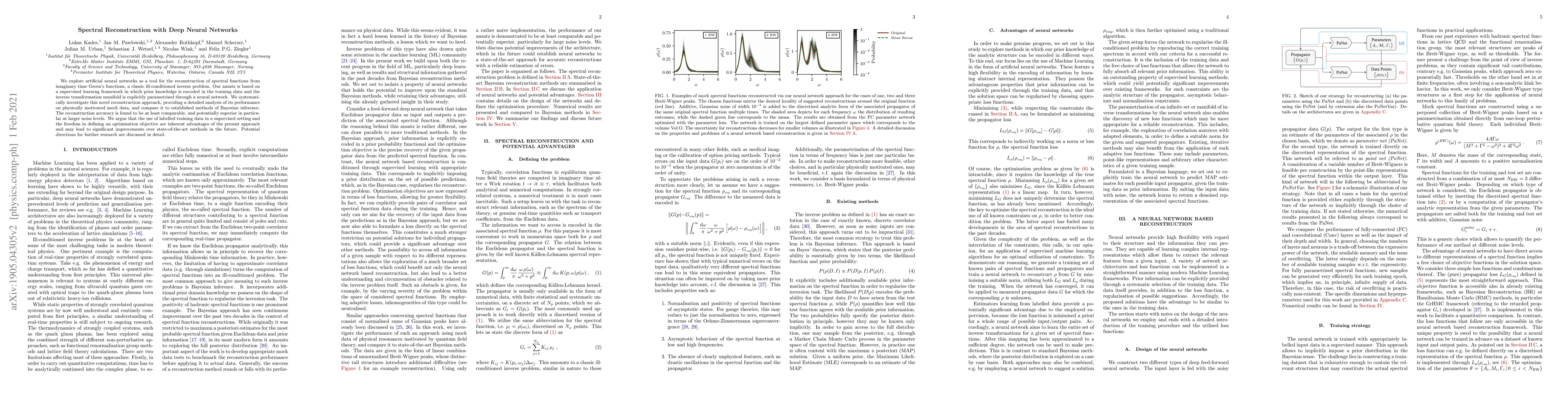 This paper investigates deep neural networks for reconstructing spectral functions from imaginary time Green's functions, addressing an ill-conditioned inverse problem. The approach uses supervised learning with neural networks to outperform established Bayesian inference methods, especially under high noise levels, by leveraging labelled training data and flexible optimization objectives.