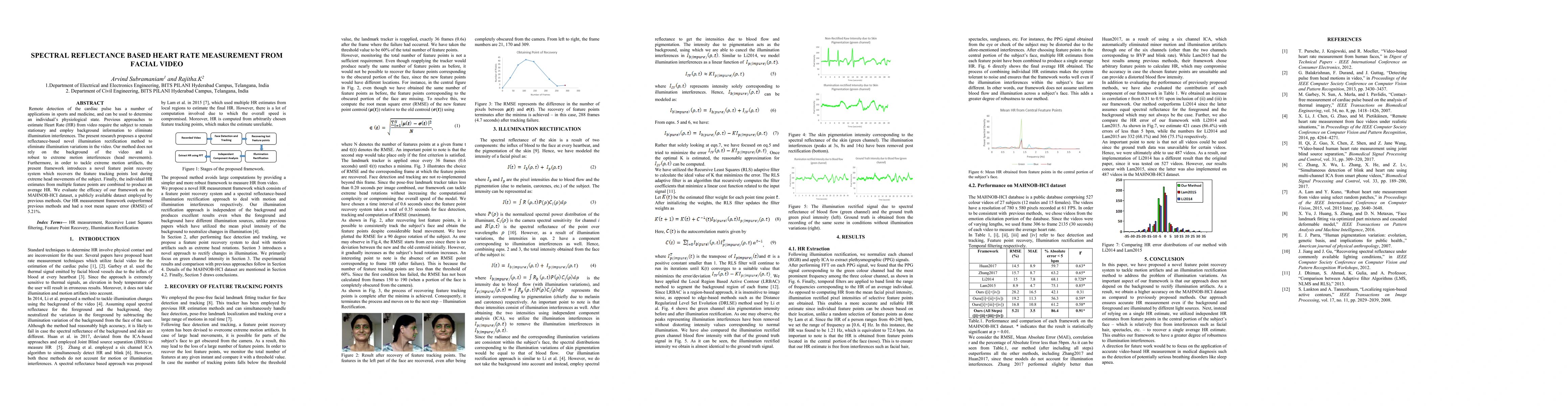 Remote detection of the cardiac pulse has a number of applications in sports and medicine, and can be used to determine the physiological state of the subject. Previous approaches to estimate Heart Rate from video require the subject to remain stationary and employ background information to eliminate illumination interferences. The present research proposes a spectral reflectance based novel illumination rectification method to eliminate illumination variations in the video. Our method does not rely on the background of the video and is robust to extreme motion interferences (head movements). Furthermore, in order to tackle extreme motion artifacts, the present framework introduces a novel feature point recovery system which recovers the feature tracking points lost during extreme head movements of the subject. Finally, the individual HR estimates from multiple feature points are combined to produce an average HR. We evaluate the efficacy of our framework on the MAHNOB HCI dataset, a publicly available dataset employed by previous methods. Our HR measurement framework outperformed previous methods and had a root mean square error of 5.21%.