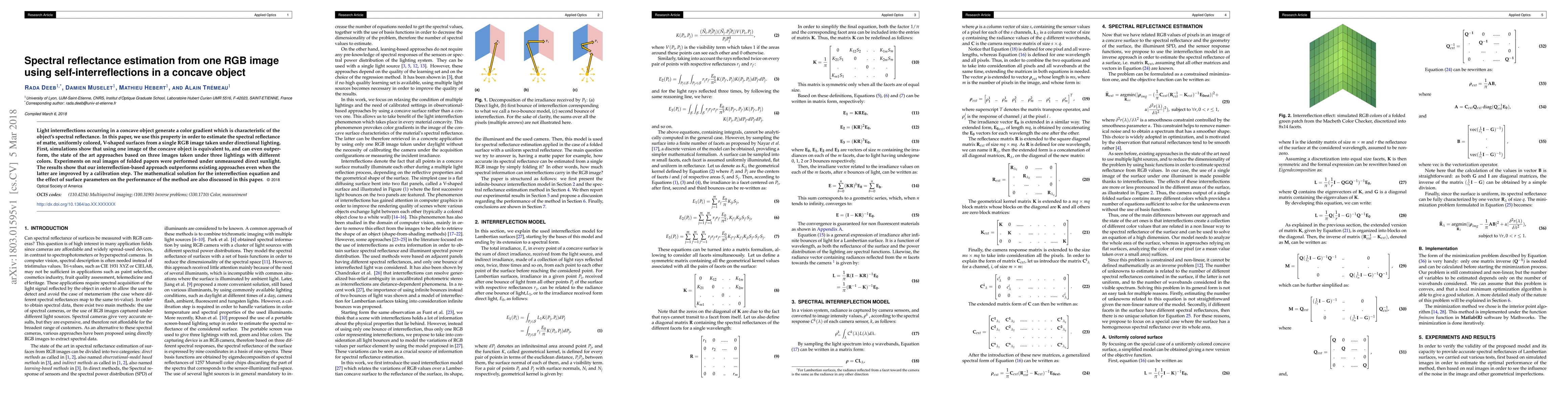 Light interreflections occurring in a concave object generate a color gradient which is characteristic of the object's spectral reflectance. In this paper, we use this property in order to estimate the spectral reflectance of matte, uniformly colored, V-shaped surfaces from a single RGB image taken under directional lighting. First, simulations show that using one image of the concave object is equivalent to, and can even outperform, the state of the art approaches based on three images taken under three lightings with different colors. Experiments on real images of folded papers were performed under unmeasured direct sunlight. The results show that our interreflection-based approach outperforms existing approaches even when the latter are improved by a calibration step. The mathematical solution for the interreflection equation and the effect of surface parameters on the performance of the method are also discussed in this paper.
