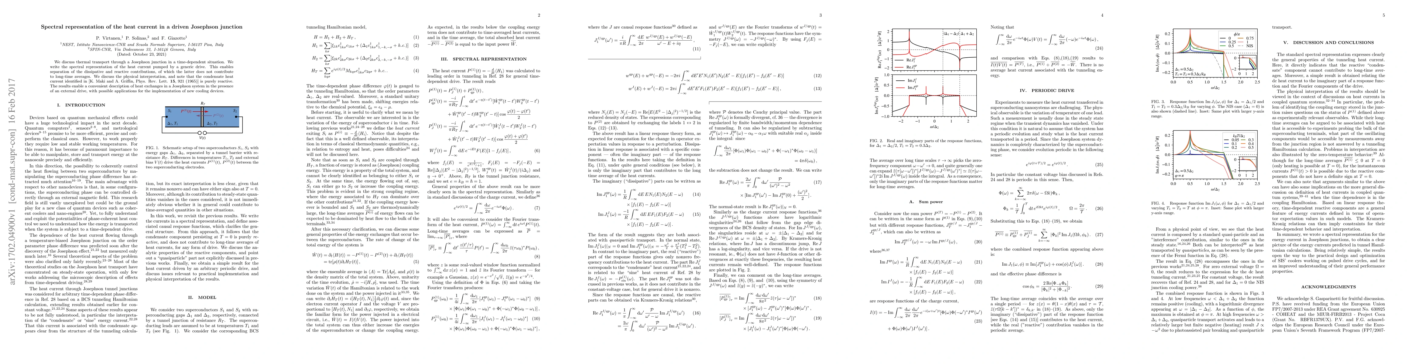This paper presents a spectral representation of the heat current in a driven Josephson junction, distinguishing between dissipative and reactive contributions. It reveals that the condensate heat current is purely reactive, facilitating a better understanding of thermal transport in Josephson systems and potential applications in cooling devices.
