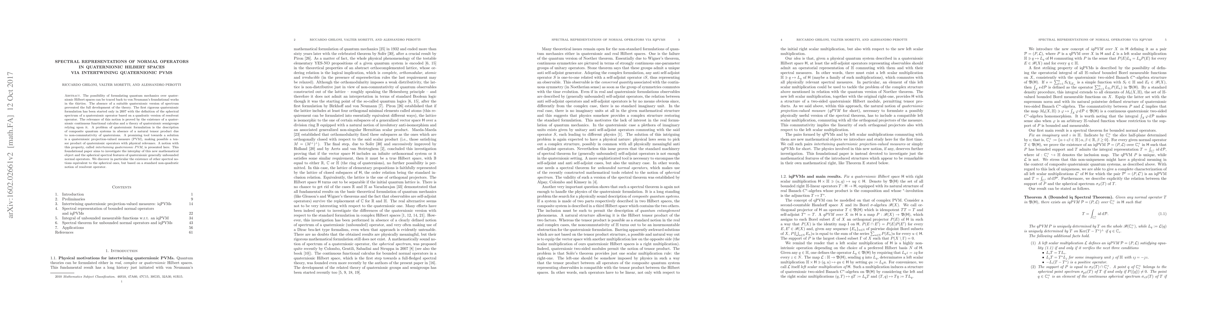 This paper introduces intertwining quaternionic projection-valued measures (PVMs) to develop a spectral theory for normal operators in quaternionic Hilbert spaces. It demonstrates how these measures allow for the formulation of a continuous functional calculus and spectral representations, providing a robust framework for describing composite quantum systems.