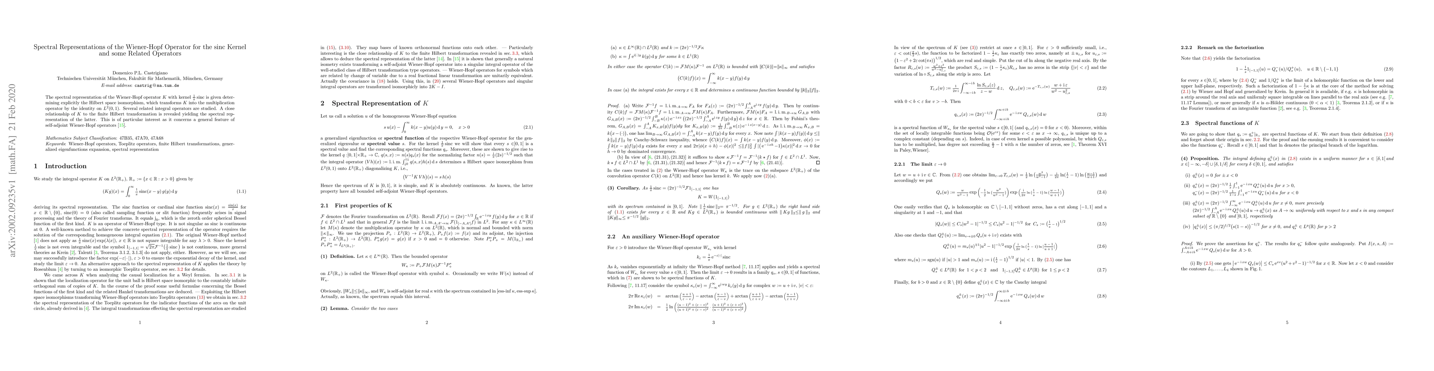 This paper provides a spectral representation for the Wiener-Hopf operator K with the sinc kernel, explicitly determining the Hilbert space isomorphism that transforms K into the identity operator on $L^2(0,1)$. It also explores related integral operators and reveals a close relationship between K and the finite Hilbert transformation, offering a spectral representation for the latter.