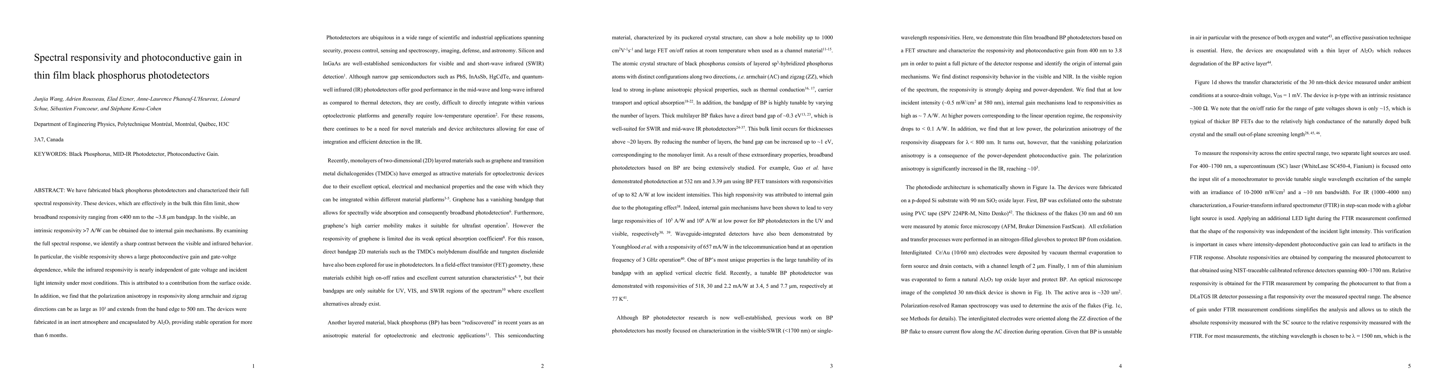 This paper investigates the spectral responsivity and photoconductive gain in thin film black phosphorus photodetectors, revealing broadband responsivity from 400 nm to 3.8 µm. The visible range exhibits high intrinsic responsivity and significant photoconductive gain, while infrared responsivity is largely independent of gate voltage and light intensity due to surface oxide contributions.