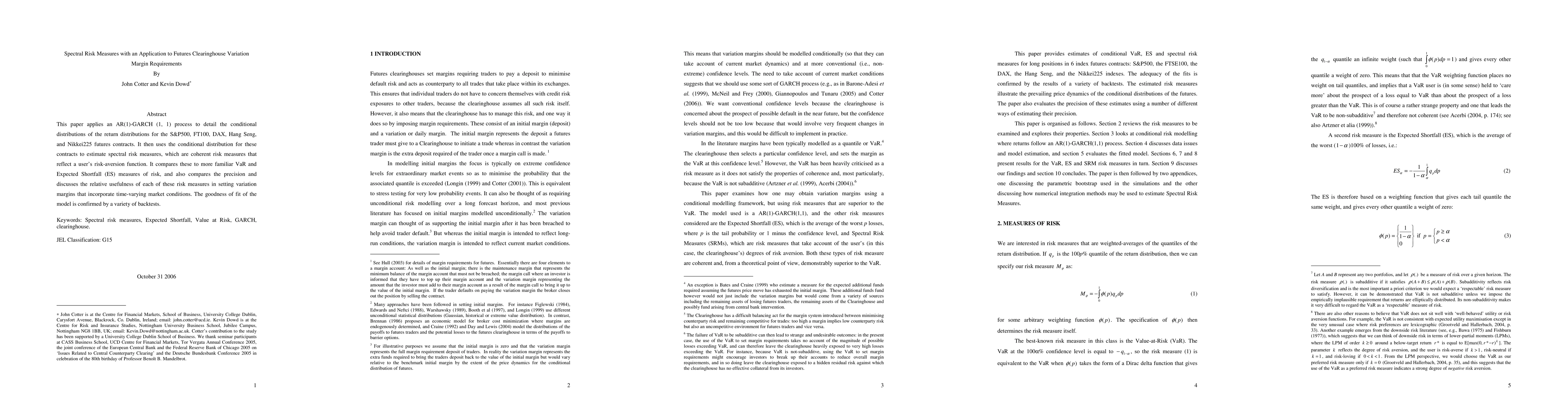 This paper applies an AR(1)-GARCH (1, 1) process to detail the conditional distributions of the return distributions for the S&P500, FT100, DAX, Hang Seng, and Nikkei225 futures contracts. It then uses the conditional distribution for these contracts to estimate spectral risk measures, which are coherent risk measures that reflect a user's risk-aversion function. It compares these to more familiar VaR and Expected Shortfall (ES) measures of risk, and also compares the precision and discusses the relative usefulness of each of these risk measures in setting variation margins that incorporate time-varying market conditions. The goodness of fit of the model is confirmed by a variety of backtests.