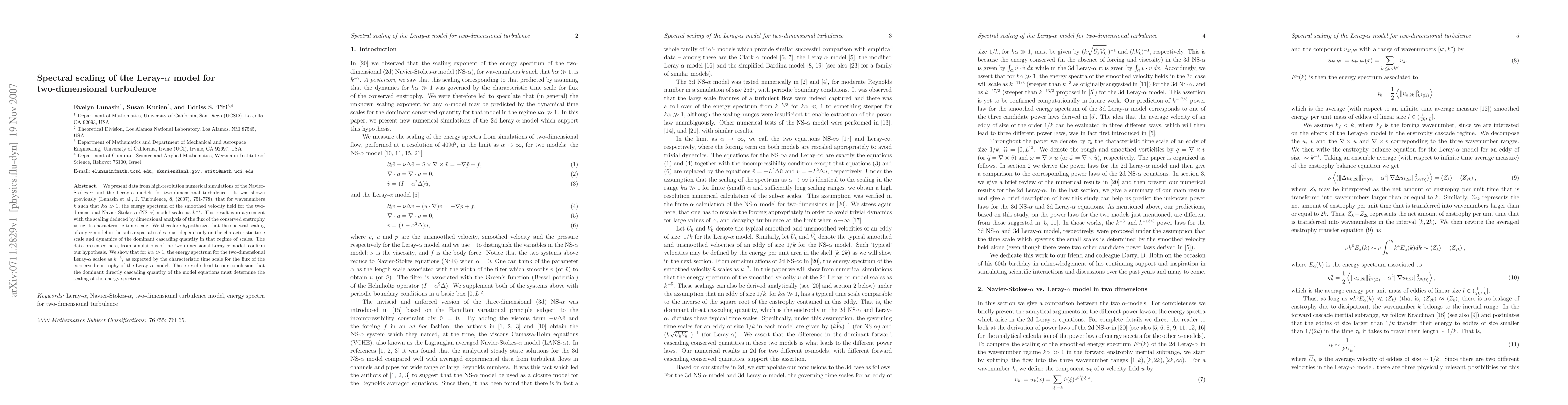 This paper reports high-resolution numerical simulations of the Leray-$\alpha$ model for two-dimensional turbulence, confirming that the energy spectrum scales as $k^{-5}$ for $k\alpha\gg 1$. This aligns with the characteristic time scale for the flux of conserved enstrophy, supporting the hypothesis that the dominant cascading quantity determines the spectral scaling.
