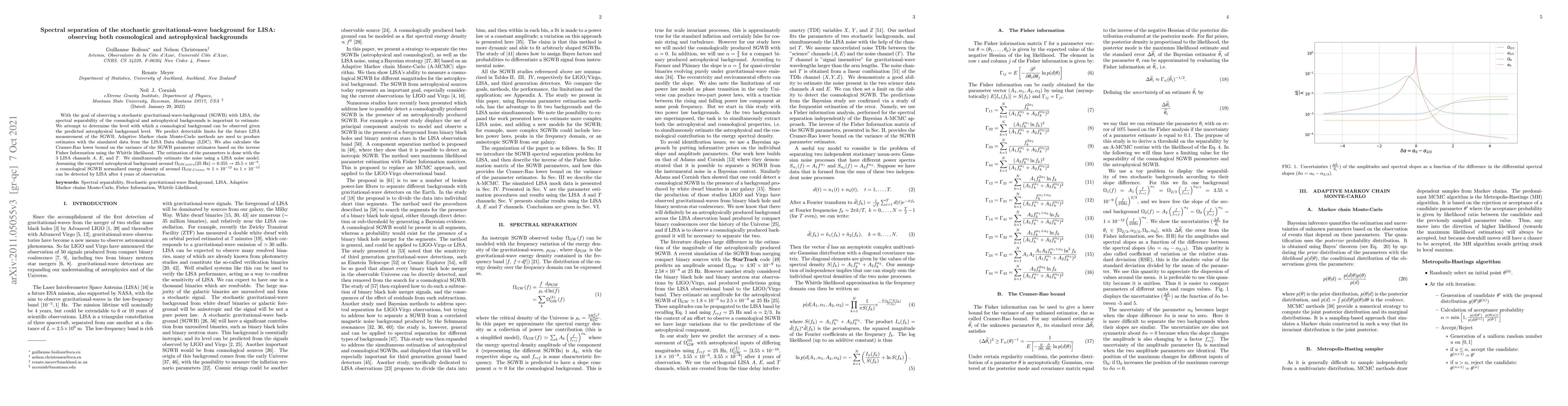 This paper investigates the spectral separability of the stochastic gravitational-wave background (SGWB) for the LISA mission, aiming to distinguish between cosmological and astrophysical sources. Using adaptive Markov chain Monte-Carlo methods and simulated LISA data, it predicts detectable limits for the SGWB, estimating a cosmological background energy density of around $1 \times 10^{-12}$ to $1 \times 10^{-13}$.