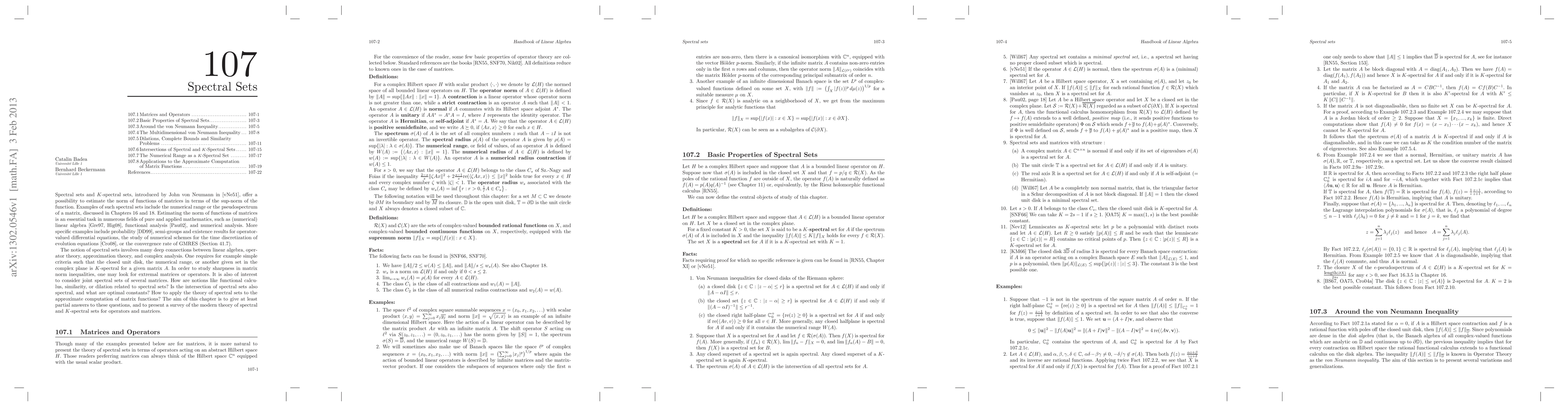 This is a survey about spectral sets, to appear in the second edition of Handbook of Linear Algebra (L. Hogben, ed.). Spectral sets and K-spectral sets, introduced by John von Neumann, offer a possibility to estimate the norm of functions of matrices in terms of the sup-norm of the function. Examples of such spectral sets include the numerical range or the pseudospectrum of a matrix, discussed in Chapters 16 and 18. Estimating the norm of functions of matrices is an essential task in numerous fields of pure and applied mathematics, such as (numerical) linear algebra, functional analysis, and numerical analysis. More specific examples include probability, semi-groups and existence results for operator-valued differential equations, the study of numerical schemes for the time discretization of evolution equations, or the convergence rate of GMRES (Section 41.7). The notion of spectral sets involves many deep connections between linear algebra, operator theory, approximation theory, and complex analysis.