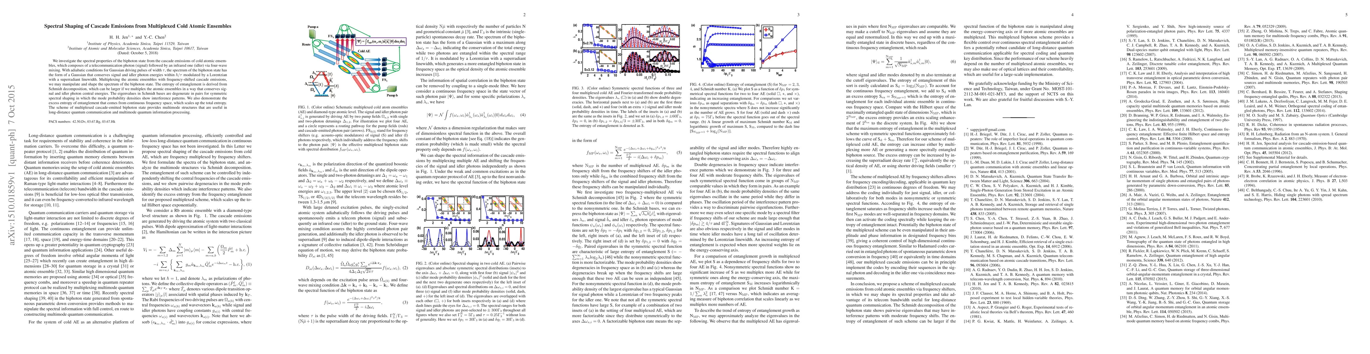 This paper explores the spectral properties of biphoton states generated through cascade emissions from multiplexed cold atomic ensembles, focusing on the manipulation of their spectra via four-wave mixing. The study reveals that multiplexing can enhance the entropy of entanglement and provide useful multimode structures for quantum communication and information processing.