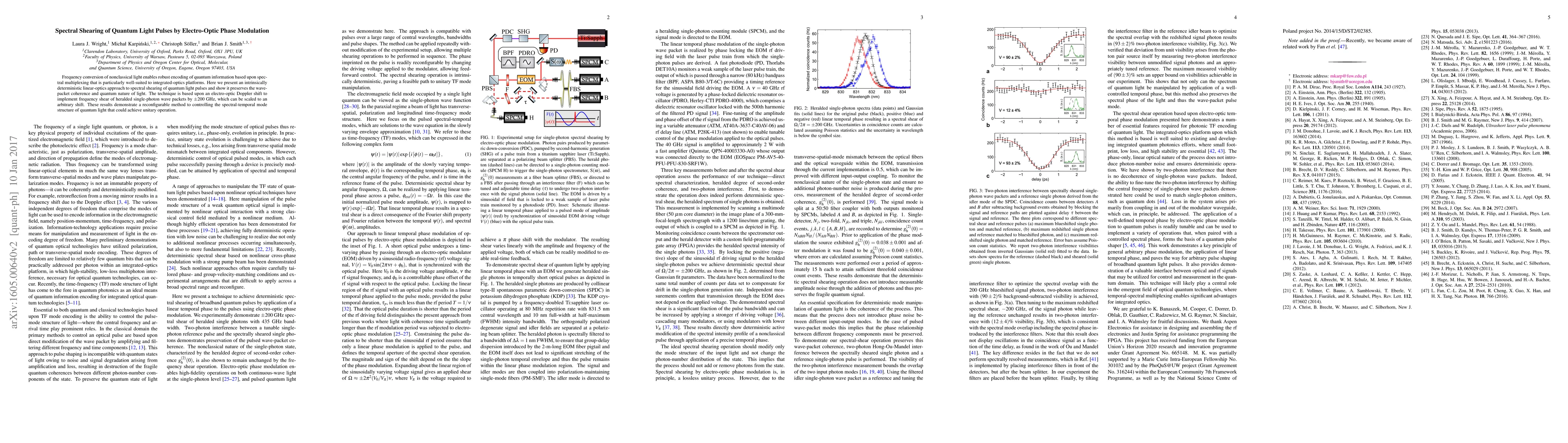 This paper presents a deterministic linear-optics method for spectral shearing of quantum light pulses using electro-optic phase modulation, preserving wave-packet coherence and quantum nature. The technique employs an electro-optic Doppler shift to achieve frequency shear of single-photon wave packets by ±200 GHz, demonstrating a reconfigurable, unitary approach to controlling quantum light's spectral-temporal mode structure.
