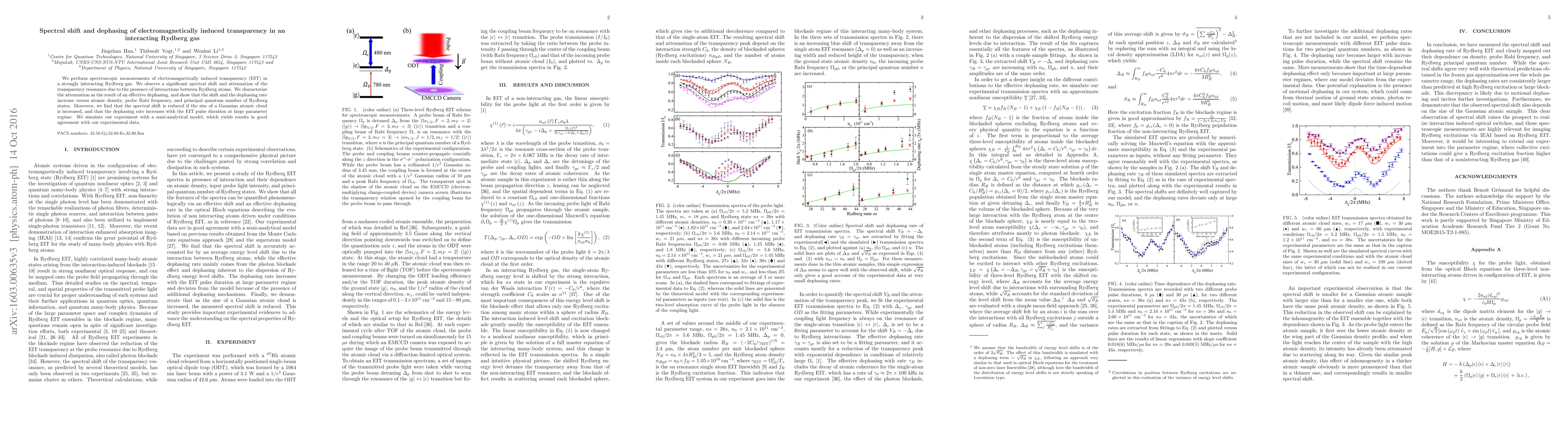 This paper reports spectroscopic measurements of electromagnetically induced transparency in an interacting Rydberg gas, revealing significant spectral shifts and dephasing effects. The observed phenomena are analyzed as functions of atomic density, probe Rabi frequency, and Rydberg quantum states, and are shown to diminish with increased atomic cloud size.