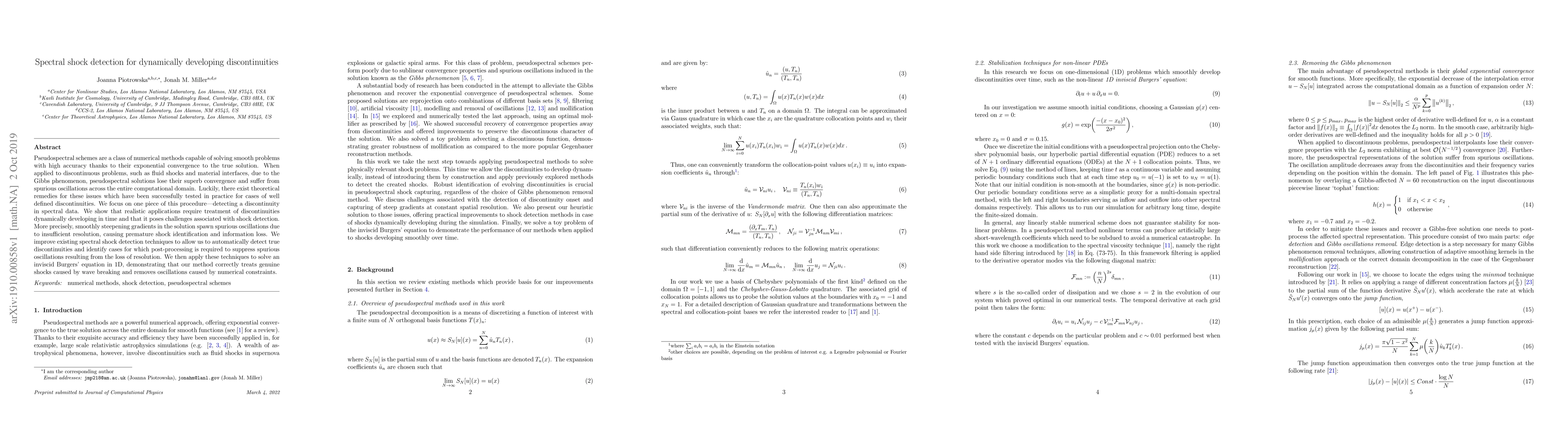 Pseudospectral schemes are a class of numerical methods capable of solving smooth problems with high accuracy thanks to their exponential convergence to the true solution. When applied to discontinuous problems, such as fluid shocks and material interfaces, due to the Gibbs phenomenon, pseudospectral solutions lose their superb convergence and suffer from spurious oscillations across the entire computational domain. Luckily, there exist theoretical remedies for these issues which have been successfully tested in practice for cases of well defined discontinuities. We focus on one piece of this procedure---detecting a discontinuity in spectral data. We show that realistic applications require treatment of discontinuities dynamically developing in time and that it poses challenges associated with shock detection. More precisely, smoothly steepening gradients in the solution spawn spurious oscillations due to insufficient resolution, causing premature shock identification and information loss. We improve existing spectral shock detection techniques to allow us to automatically detect true discontinuities and identify cases for which post-processing is required to suppress spurious oscillations resulting from the loss of resolution. We then apply these techniques to solve an inviscid Burgers' equation in 1D, demonstrating that our method correctly treats genuine shocks caused by wave breaking and removes oscillations caused by numerical constraints.