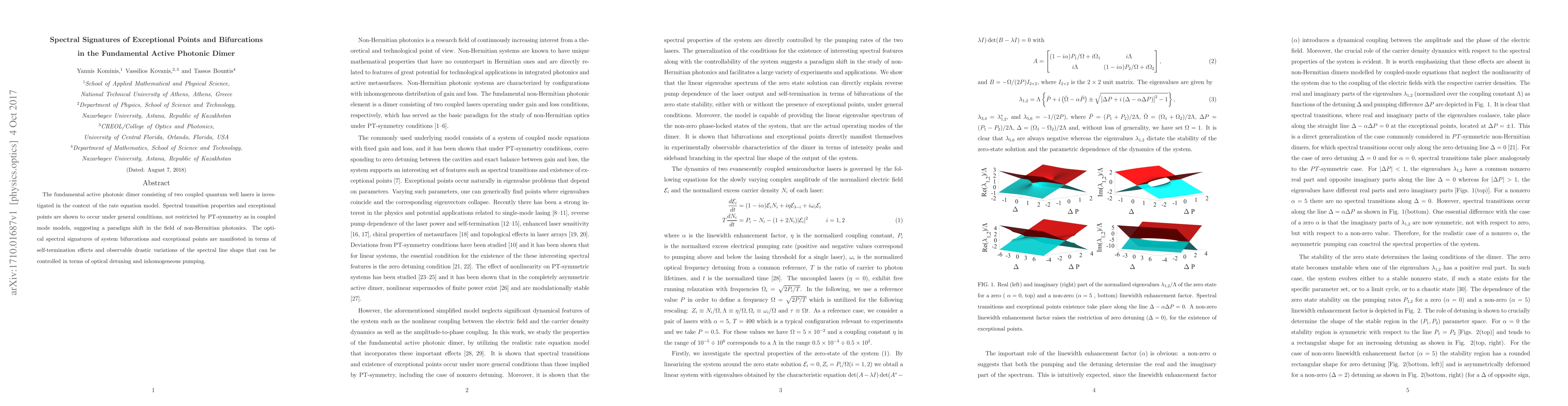 The fundamental active photonic dimer consisting of two coupled quantum well lasers is investigated in the context of the rate equation model. Spectral transition properties and exceptional points are shown to occur under general conditions, not restricted by PT-symmetry as in coupled mode models, suggesting a paradigm shift in the field of non-Hermitian photonics. The optical spectral signatures of system bifurcations and exceptional points are manifested in terms of self-termination effects and observable drastic variations of the spectral line shape that can be controlled in terms of optical detuning and inhomogeneous pumping.