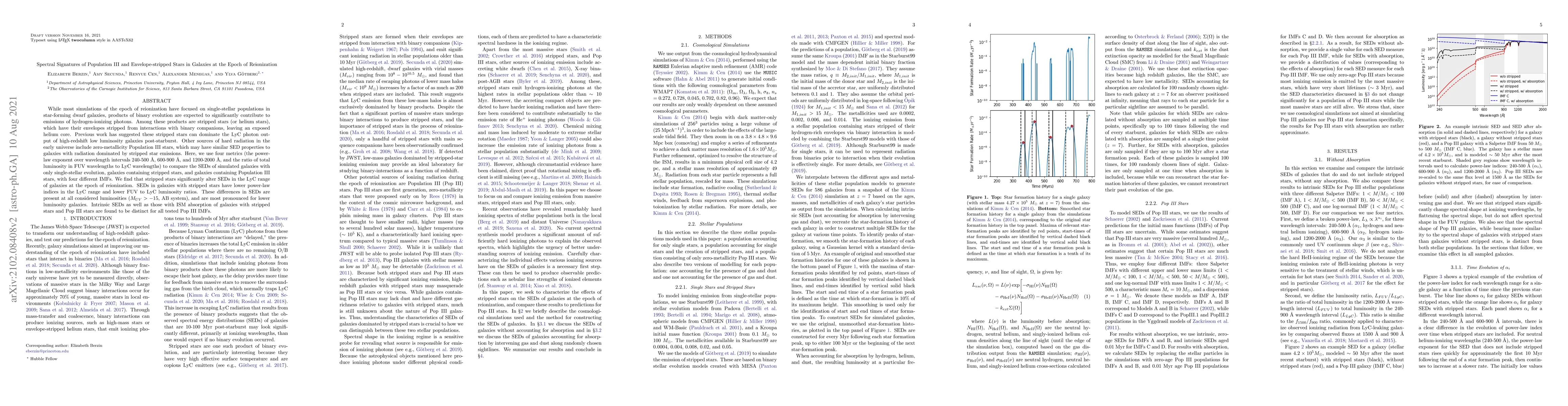 This paper investigates the spectral signatures of stripped stars and Population III stars in galaxies at the reionization epoch, finding that stripped stars significantly alter the spectral energy distributions (SEDs) in the Lyman continuum (LyC) range, leading to lower power-law indices and FUV to LyC luminosity ratios, especially in low luminosity galaxies. The study concludes that SEDs of galaxies with stripped stars differ distinctly from those dominated by Population III stars.