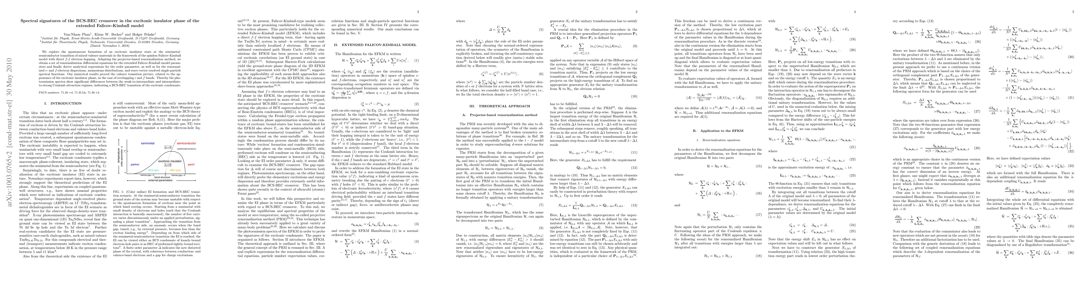 This paper investigates the excitonic insulator phase in mixed-valence materials using the extended Falicov-Kimball model, revealing a BCS-BEC crossover through spectral signatures in photoemission spectra. Analytical expressions and numerical results confirm the transition from weak to strong Coulomb attraction, highlighting the differences in spectral functions.