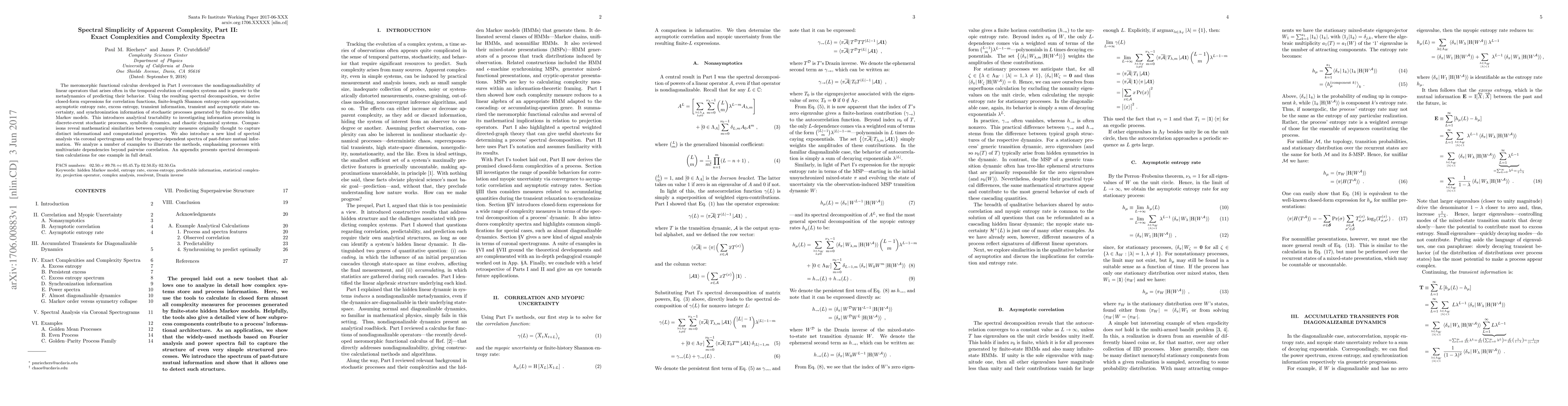 The meromorphic functional calculus developed in Part I overcomes the nondiagonalizability of linear operators that arises often in the temporal evolution of complex systems and is generic to the metadynamics of predicting their behavior. Using the resulting spectral decomposition, we derive closed-form expressions for correlation functions, finite-length Shannon entropy-rate approximates, asymptotic entropy rate, excess entropy, transient information, transient and asymptotic state uncertainty, and synchronization information of stochastic processes generated by finite-state hidden Markov models. This introduces analytical tractability to investigating information processing in discrete-event stochastic processes, symbolic dynamics, and chaotic dynamical systems. Comparisons reveal mathematical similarities between complexity measures originally thought to capture distinct informational and computational properties. We also introduce a new kind of spectral analysis via coronal spectrograms and the frequency-dependent spectra of past-future mutual information. We analyze a number of examples to illustrate the methods, emphasizing processes with multivariate dependencies beyond pairwise correlation. An appendix presents spectral decomposition calculations for one example in full detail.