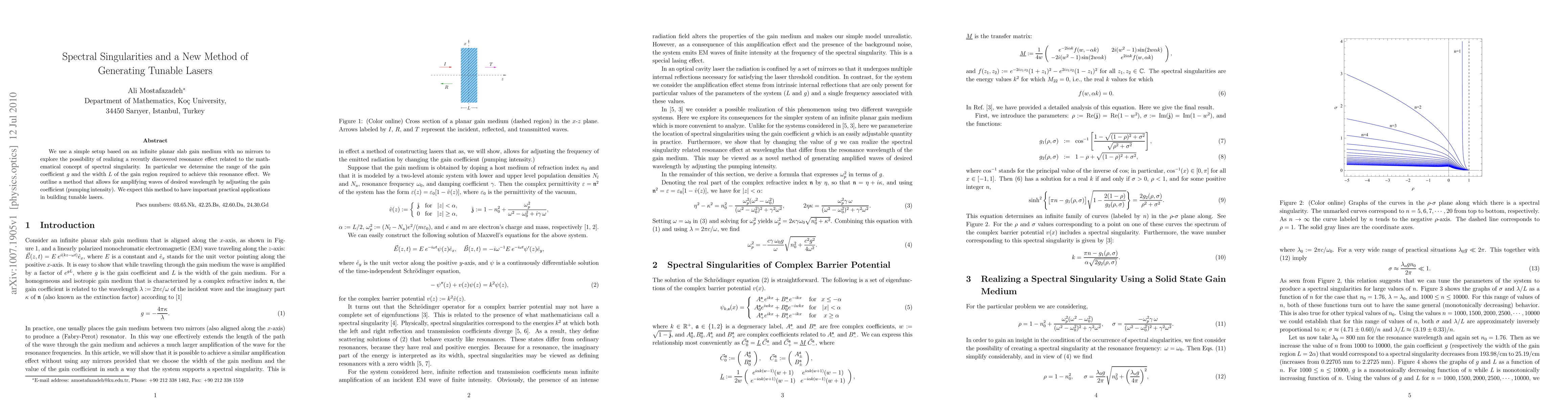 This paper explores a novel method for generating tunable lasers based on spectral singularities in an infinite planar slab gain medium. The authors determine the necessary gain coefficient and gain region width to achieve the desired resonance effect, enabling the amplification of specific wavelengths by adjusting the pumping intensity.