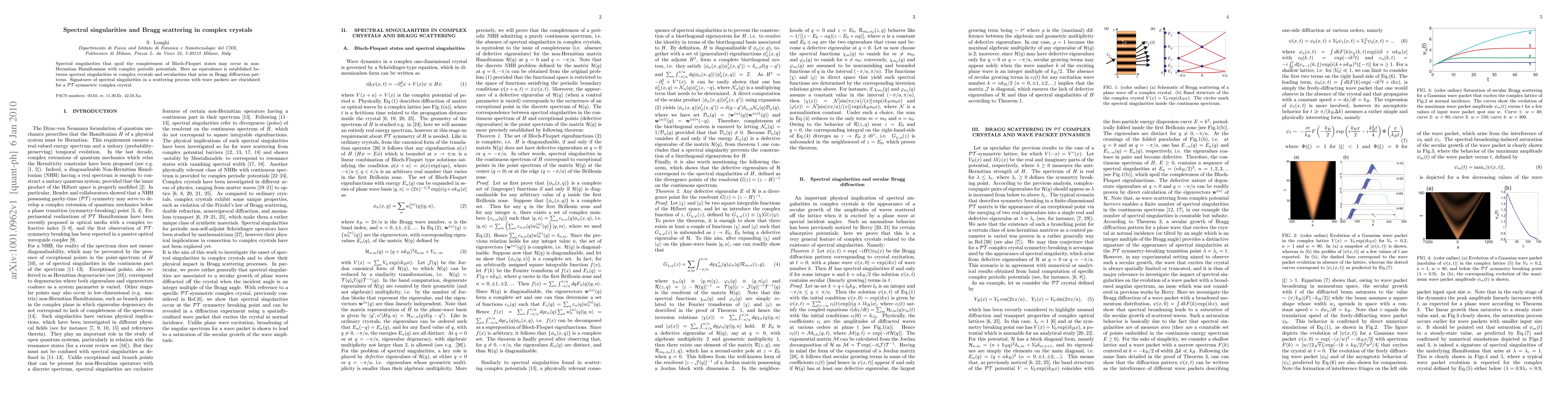 This paper explores spectral singularities in non-Hermitian Hamiltonians with complex periodic potentials, establishing an equivalence between these singularities and secularities in Bragg diffraction patterns. It demonstrates the impact of these singularities on wave packet scattering in PT-symmetric complex crystals.