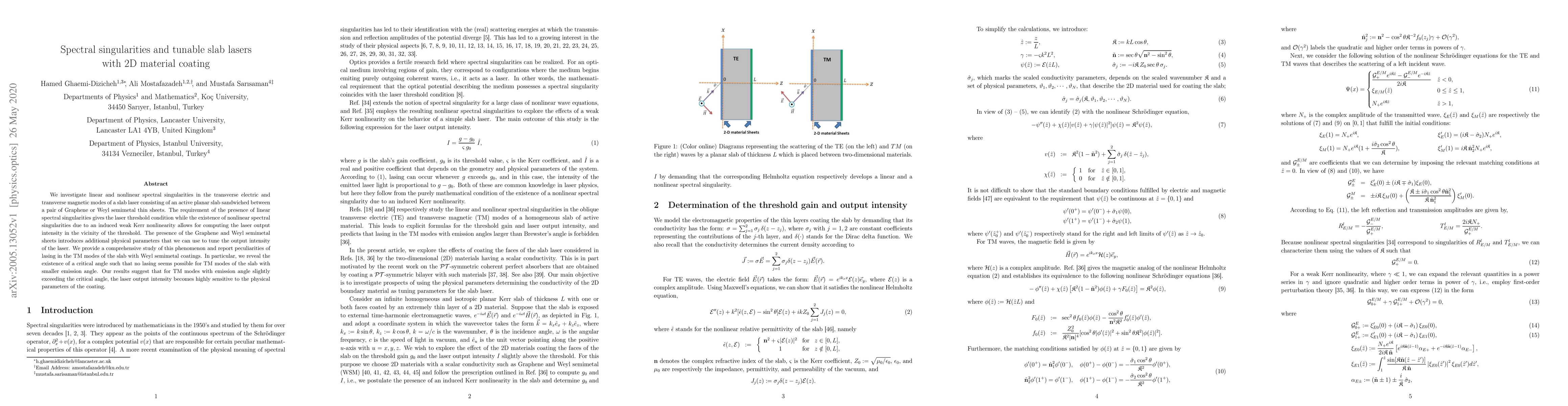 This paper explores linear and nonlinear spectral singularities in slab lasers coated with Graphene or Weyl semimetals, revealing how these materials enable tuning of laser output intensity. It identifies a critical angle for TM modes, where lasing is hindered, and shows that slight deviations from this angle make the laser output highly sensitive to coating parameters.