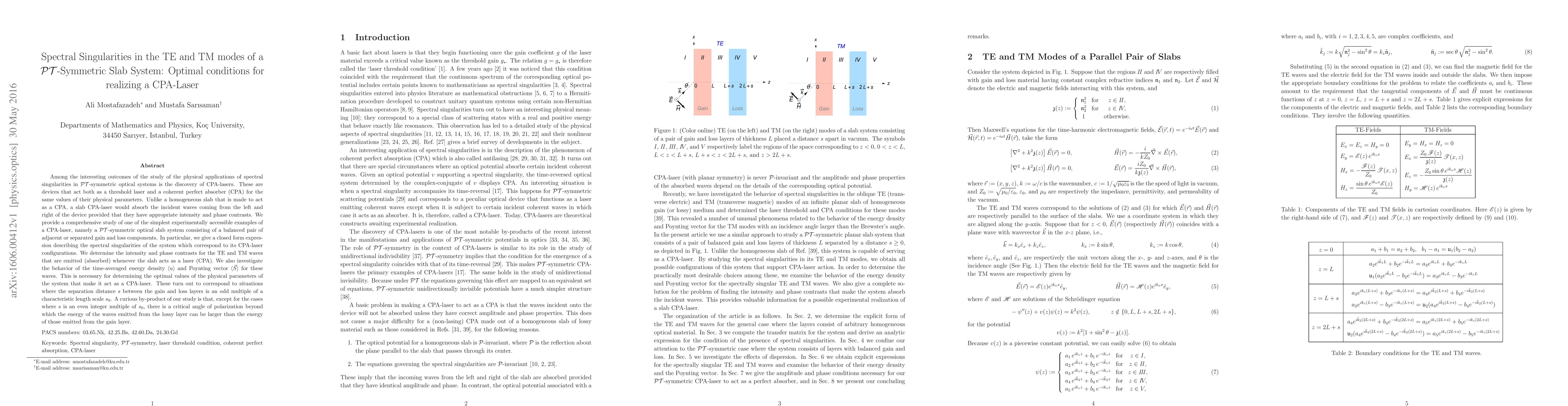 This paper investigates the spectral singularities in PT-symmetric optical slab systems, identifying conditions for realizing a coherent perfect absorber (CPA) laser. It provides a closed-form expression for the system's spectral singularities and determines optimal parameter values for the slab to function as both a CPA and a laser.