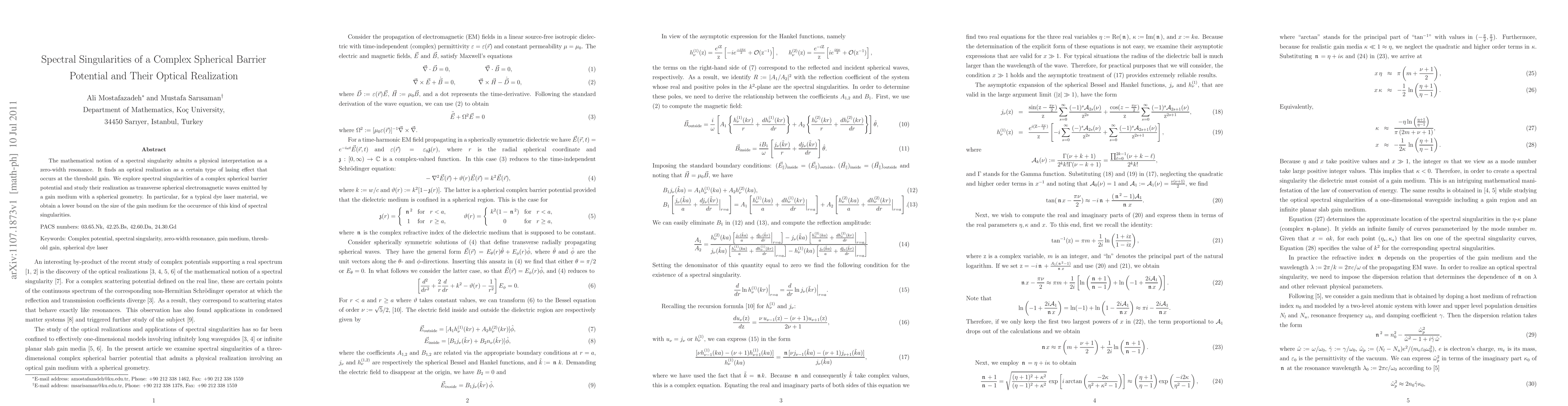 This paper investigates spectral singularities in a complex spherical barrier potential, interpreting them as zero-width resonances that manifest as a specific lasing effect at threshold gain. It explores their optical realization through transverse spherical electromagnetic waves emitted by a dye laser medium with spherical geometry, determining a lower bound for the gain medium size for these singularities to occur.