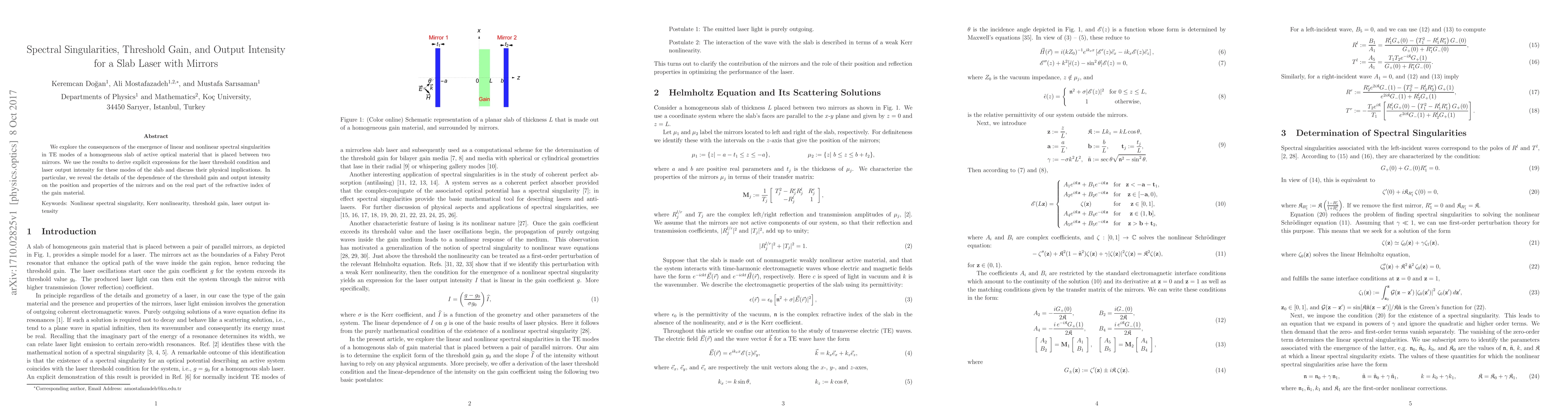 We explore the consequences of the emergence of linear and nonlinear spectral singularities in TE modes of a homogeneous slab of active optical material that is placed between two mirrors. We use the results together with two basic postulates regarding the behavior of laser light emission to derive explicit expressions for the laser threshold condition and output intensity for these modes of the slab and discuss their physical implications. In particular, we reveal the details of the dependence of the threshold gain and output intensity on the position and properties of the mirrors and on the real part of the refractive index of the gain material.
