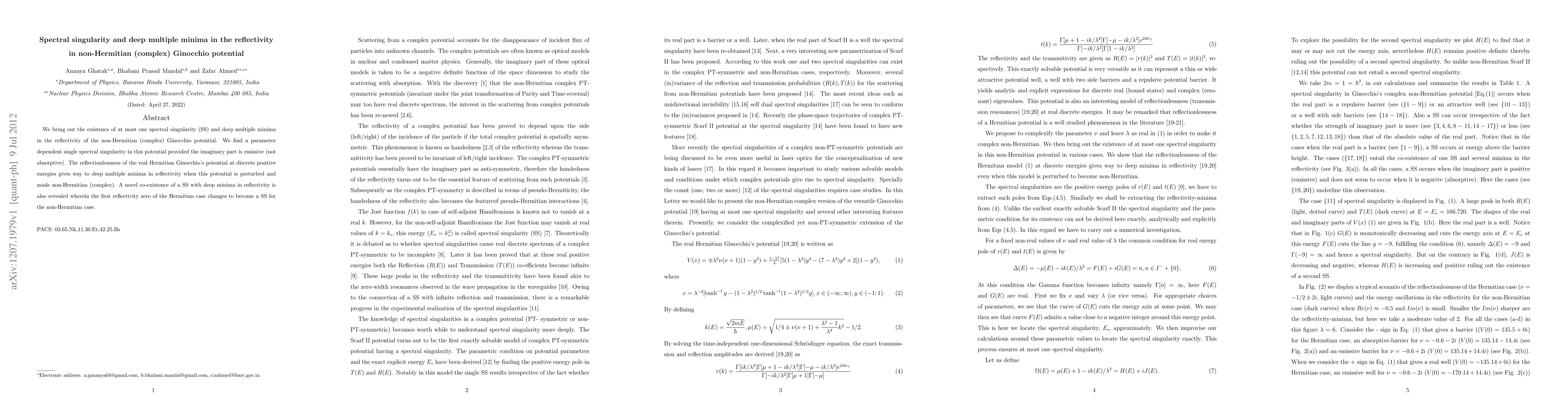 We bring out the existence of at most one spectral singularity (SS) and deep multiple minima in the reflectivity of the non-Hermitian (complex) Ginocchio potential. We find a parameter dependent single spectral singularity in this potential provided the imaginary part is emissive (not absorptive). The reflectionlessness of the real Hermitian Ginocchio's potential at discrete positive energies gives way to deep multiple minima in reflectivity when this potential is perturbed and made non-Hermitian (complex). A novel co-existence of a SS with deep minima in reflectivity is also revealed wherein the first reflectivity zero of the Hermitian case changes to become a SS for the non-Hermitian case. {PACS: 03.65.Nk,11.30.Er,42.25.Bs}