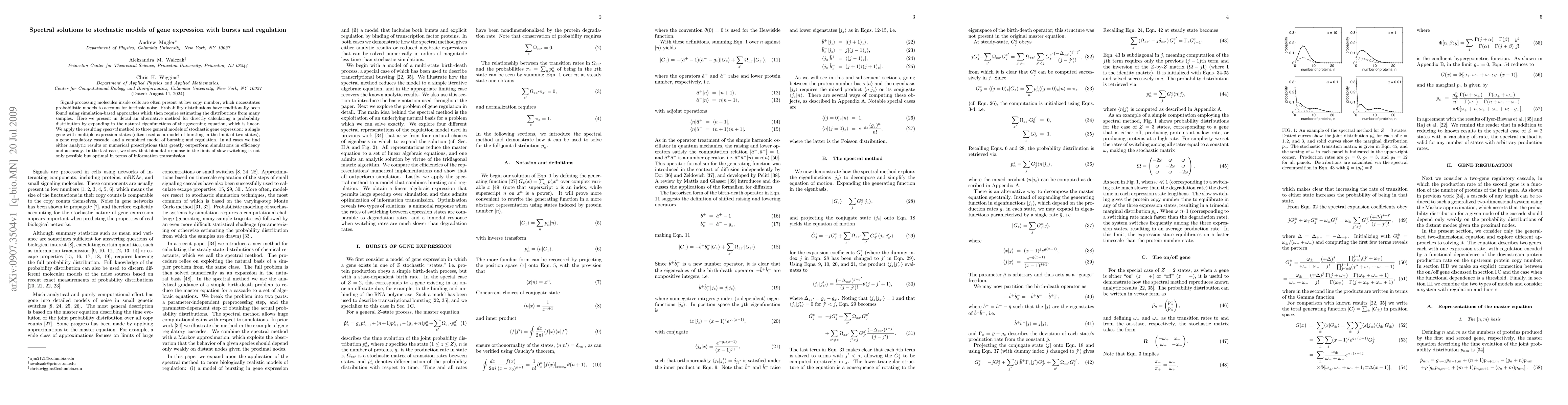 This paper introduces a spectral method for calculating probability distributions in stochastic gene expression models, offering an efficient alternative to simulation-based approaches. The method is applied to models of bursting and regulation, demonstrating improved efficiency and accuracy over traditional simulations.