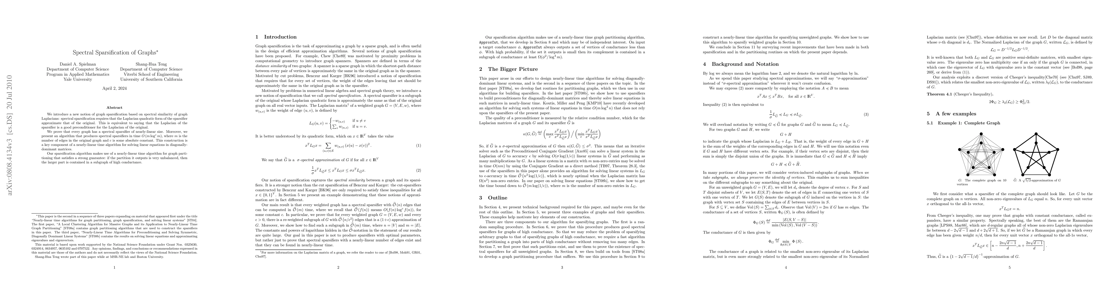 Spectral Sparsification of Graphs introduces a method to create a nearly linear-sized graph that approximates the spectral properties of the original graph's Laplacian. The algorithm runs in time $\softO{m}$ and is crucial for solving linear equations in diagonally-dominant matrices efficiently.
