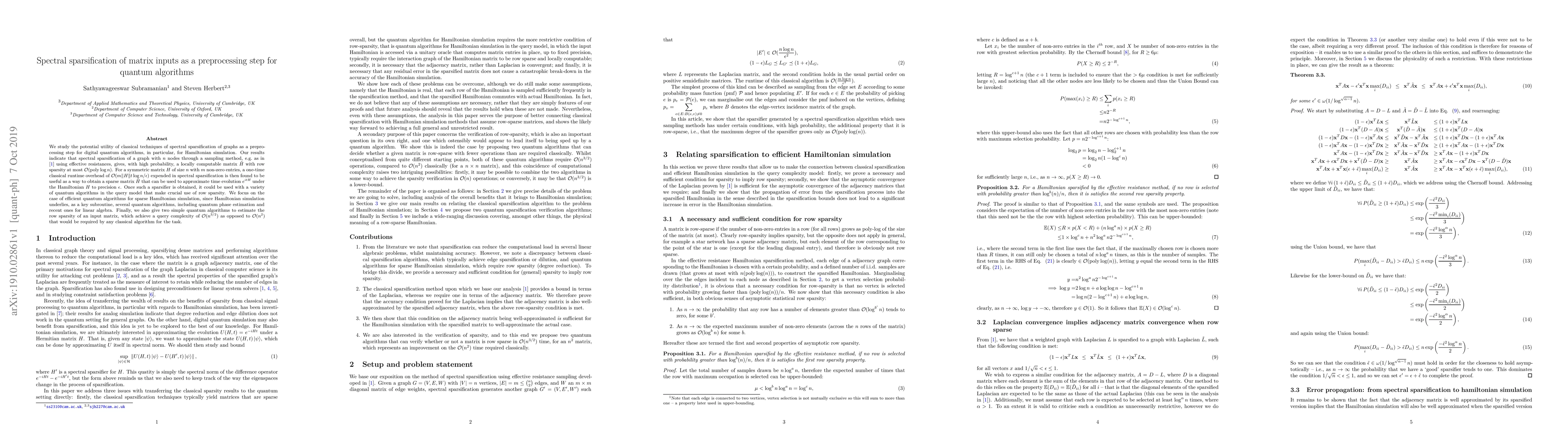 This paper explores the use of spectral sparsification as a classical preprocessing step to enhance quantum algorithms, particularly Hamiltonian simulation. It demonstrates that spectral sparsification can yield a sparse matrix that approximates time evolution efficiently, reducing computational overhead.