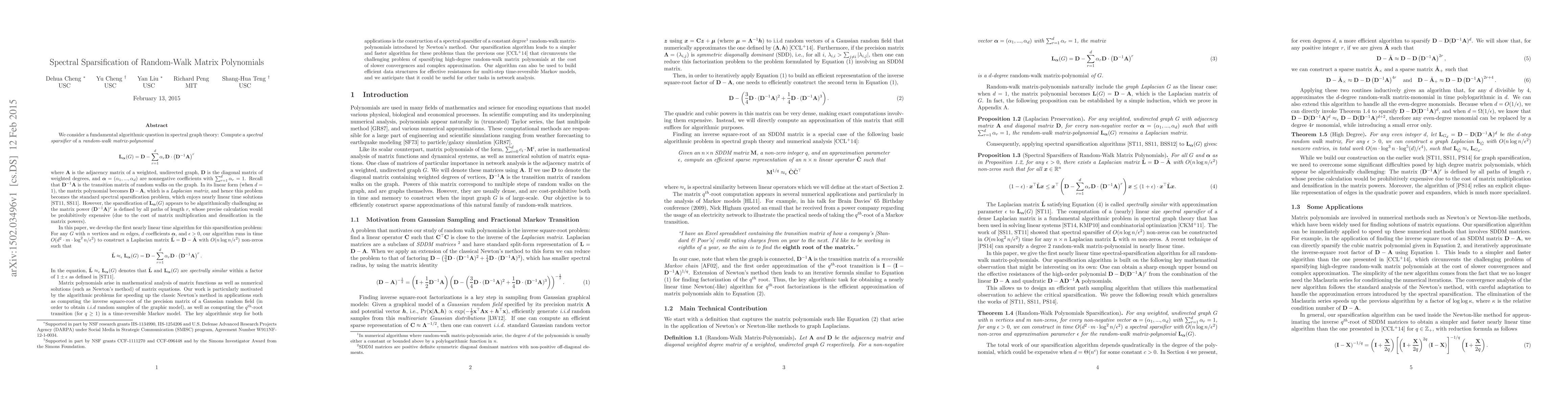 We consider a fundamental algorithmic question in spectral graph theory: Compute a spectral sparsifier of random-walk matrix-polynomial $$L_\alpha(G)=D-\sum_{r=1}^d\alpha_rD(D^{-1}A)^r$$ where $A$ is the adjacency matrix of a weighted, undirected graph, $D$ is the diagonal matrix of weighted degrees, and $\alpha=(\alpha_1...\alpha_d)$ are nonnegative coefficients with $\sum_{r=1}^d\alpha_r=1$. Recall that $D^{-1}A$ is the transition matrix of random walks on the graph. The sparsification of $L_\alpha(G)$ appears to be algorithmically challenging as the matrix power $(D^{-1}A)^r$ is defined by all paths of length $r$, whose precise calculation would be prohibitively expensive. In this paper, we develop the first nearly linear time algorithm for this sparsification problem: For any $G$ with $n$ vertices and $m$ edges, $d$ coefficients $\alpha$, and $\epsilon > 0$, our algorithm runs in time $O(d^2m\log^2n/\epsilon^{2})$ to construct a Laplacian matrix $\tilde{L}=D-\tilde{A}$ with $O(n\log n/\epsilon^{2})$ non-zeros such that $\tilde{L}\approx_{\epsilon}L_\alpha(G)$. Matrix polynomials arise in mathematical analysis of matrix functions as well as numerical solutions of matrix equations. Our work is particularly motivated by the algorithmic problems for speeding up the classic Newton's method in applications such as computing the inverse square-root of the precision matrix of a Gaussian random field, as well as computing the $q$th-root transition (for $q\geq1$) in a time-reversible Markov model. The key algorithmic step for both applications is the construction of a spectral sparsifier of a constant degree random-walk matrix-polynomials introduced by Newton's method. Our algorithm can also be used to build efficient data structures for effective resistances for multi-step time-reversible Markov models, and we anticipate that it could be useful for other tasks in network analysis.