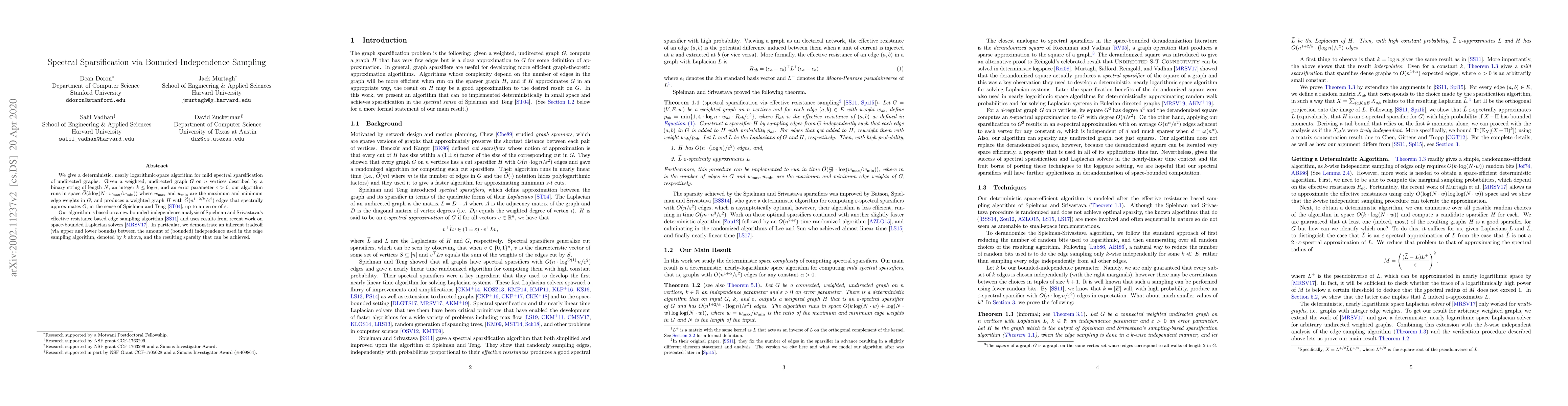 This paper presents a deterministic, nearly logarithmic-space algorithm for mild spectral sparsification of undirected graphs, achieving a sparse approximation with $\tilde{O}(n^{1+2/k}/\epsilon^2)$ edges, based on bounded-independence analysis of Spielman and Srivastava's edge sampling method.
