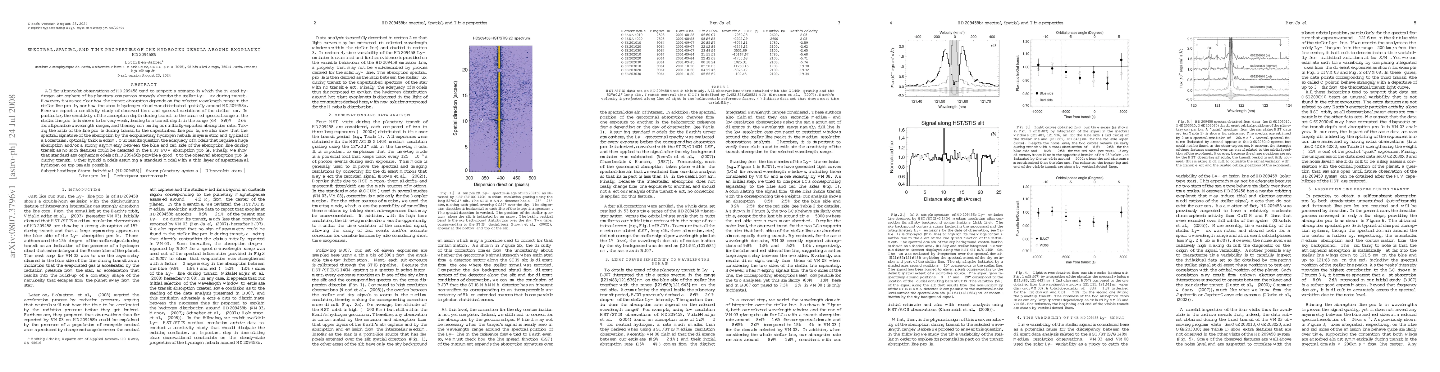 The study examines the hydrogen nebula around exoplanet HD209458b, finding a consistent absorption rate across different wavelength ranges, indicating a symmetric Lorentzian medium, and confirming that standard atmospheric models fit the observed profile.
