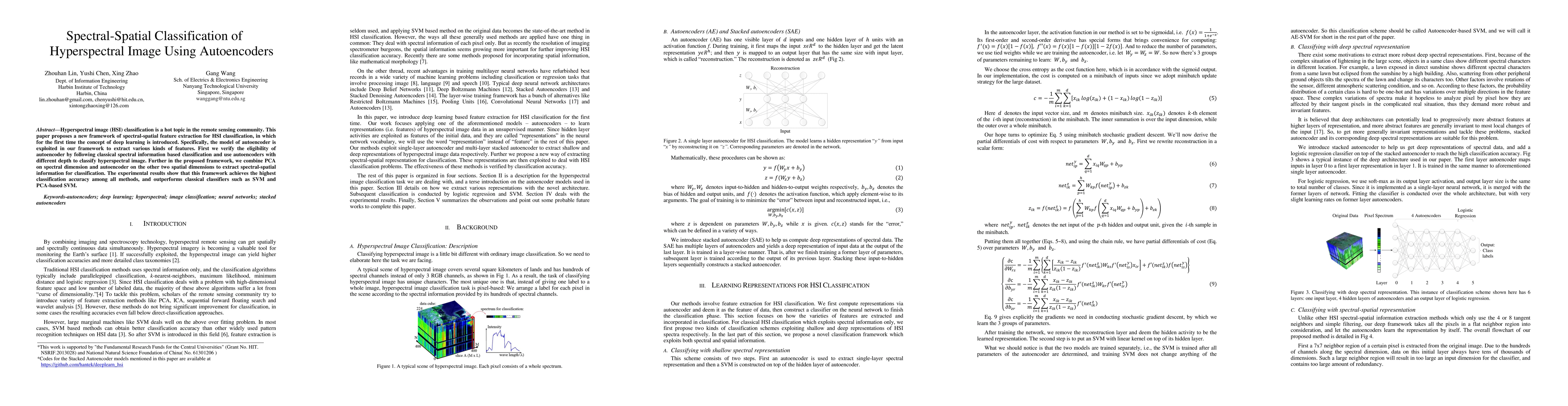 This paper proposes a new deep learning framework using autoencoders for spectral-spatial feature extraction in hyperspectral image classification, achieving superior classification accuracy compared to classical methods like SVM and PCA-based SVM. The framework combines PCA for spectral features and autoencoders for spatial features.